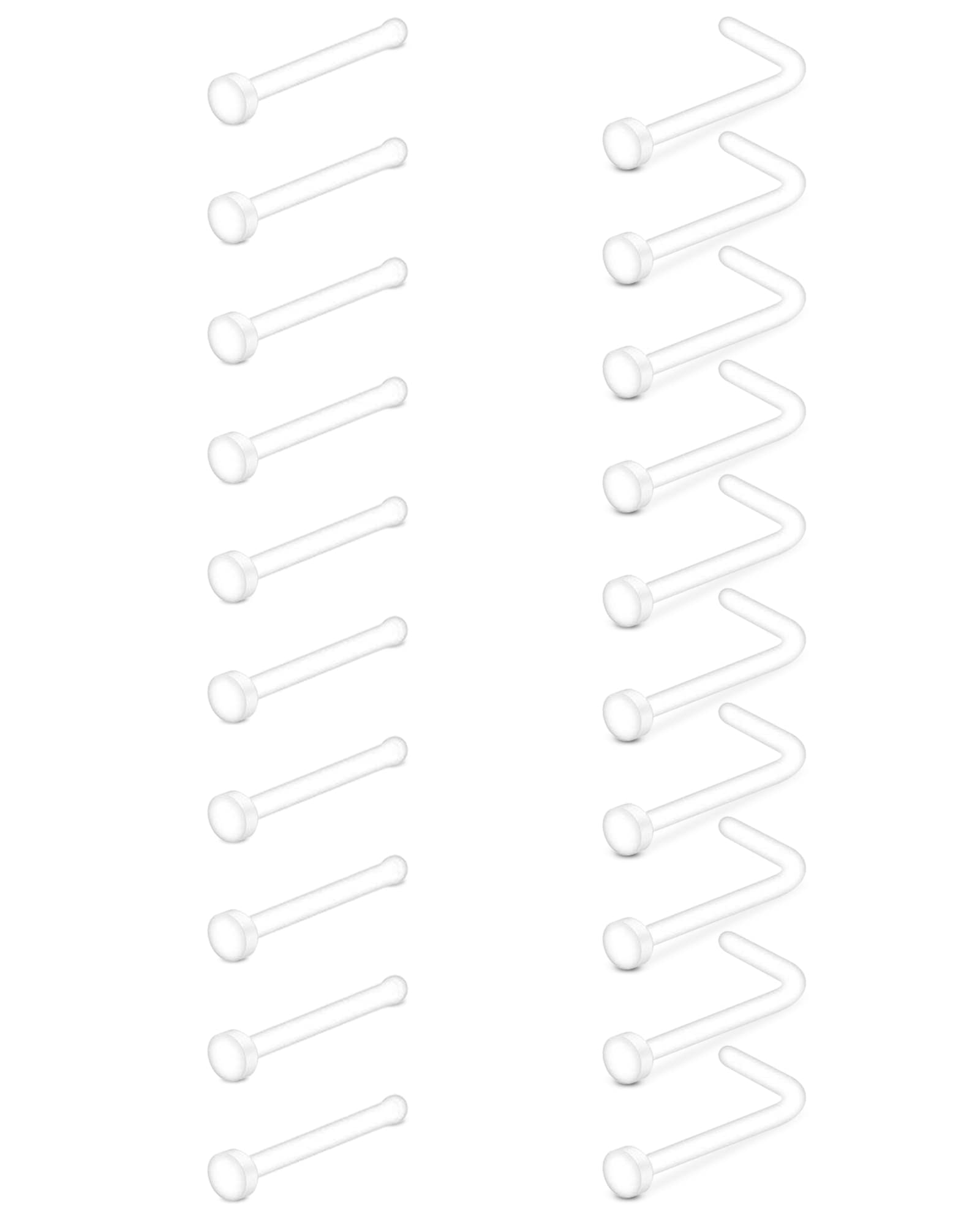 - [Total 20pcs] Come with 10pcs L shape clear nose studs + 10pcs straight nose piercing retainer, with a black velvet pouch.