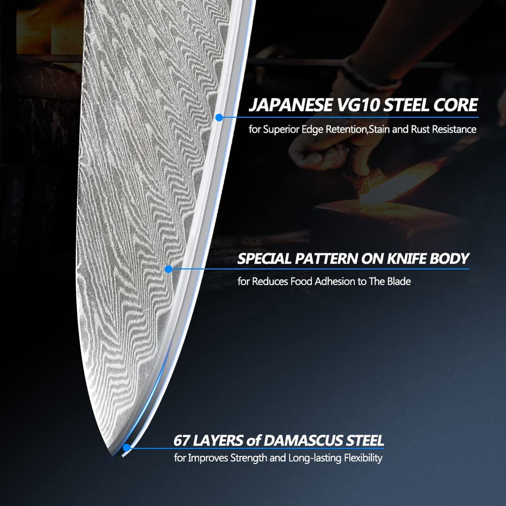 - VG-10 steel coreJapanese Damascus chef knife is made of professional super steel VG-10 core (made of 67 layers of Damascus high carbon stainless steel), under vacuum heat treatment and nitrogen cooling technology thus obtaining the best characteristics of the steel, has been the first choice of cooking beginners, professional chefs and ordinary families.