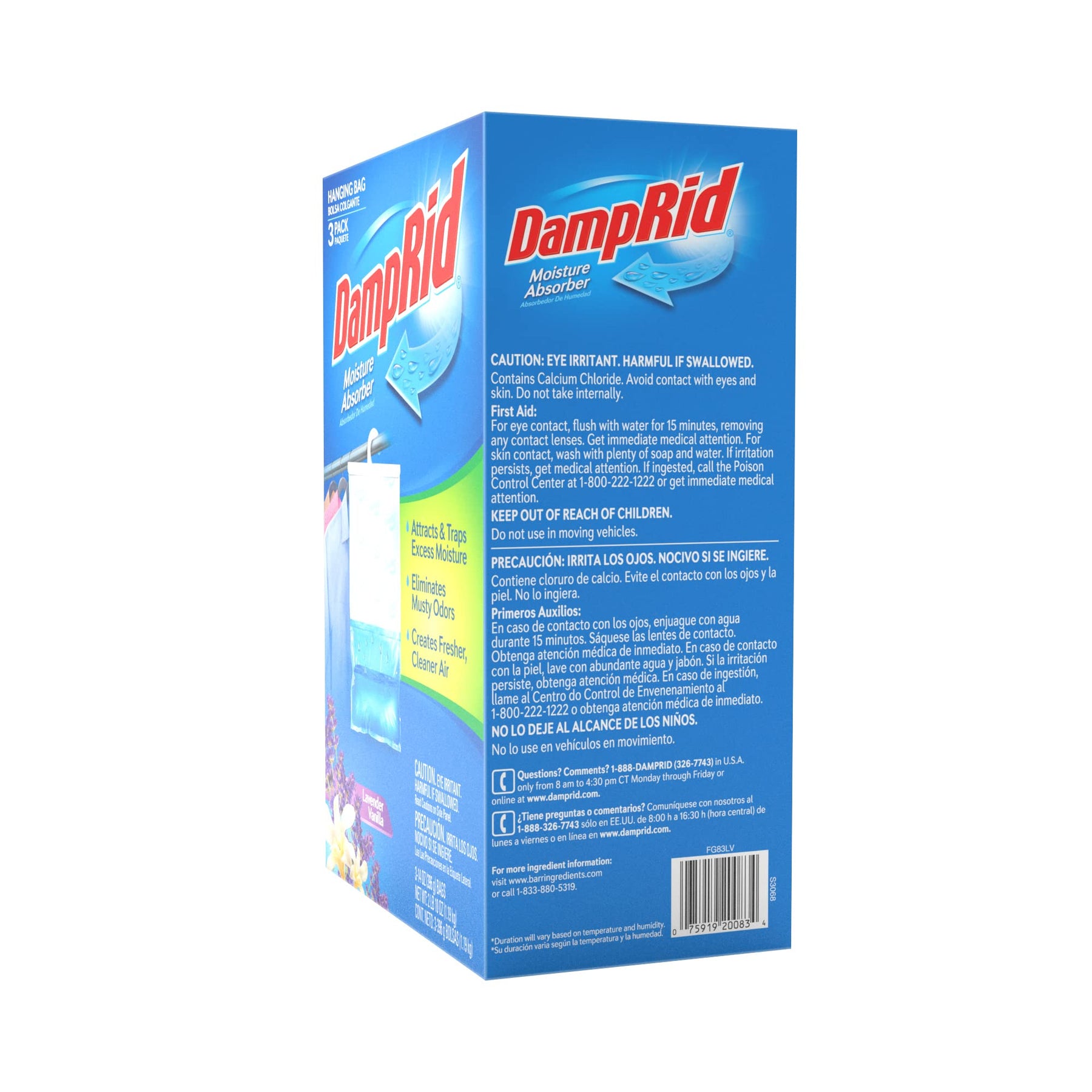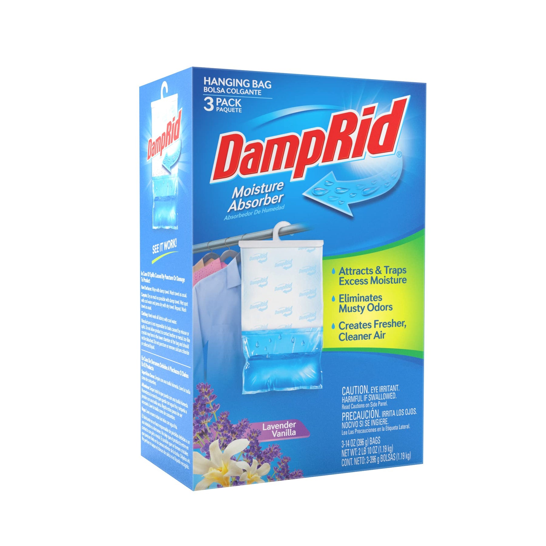 - DampRid Lavender Vanilla Hanging Moisture Absorber attracts and traps excess moisture from the air, eliminating musty odors.