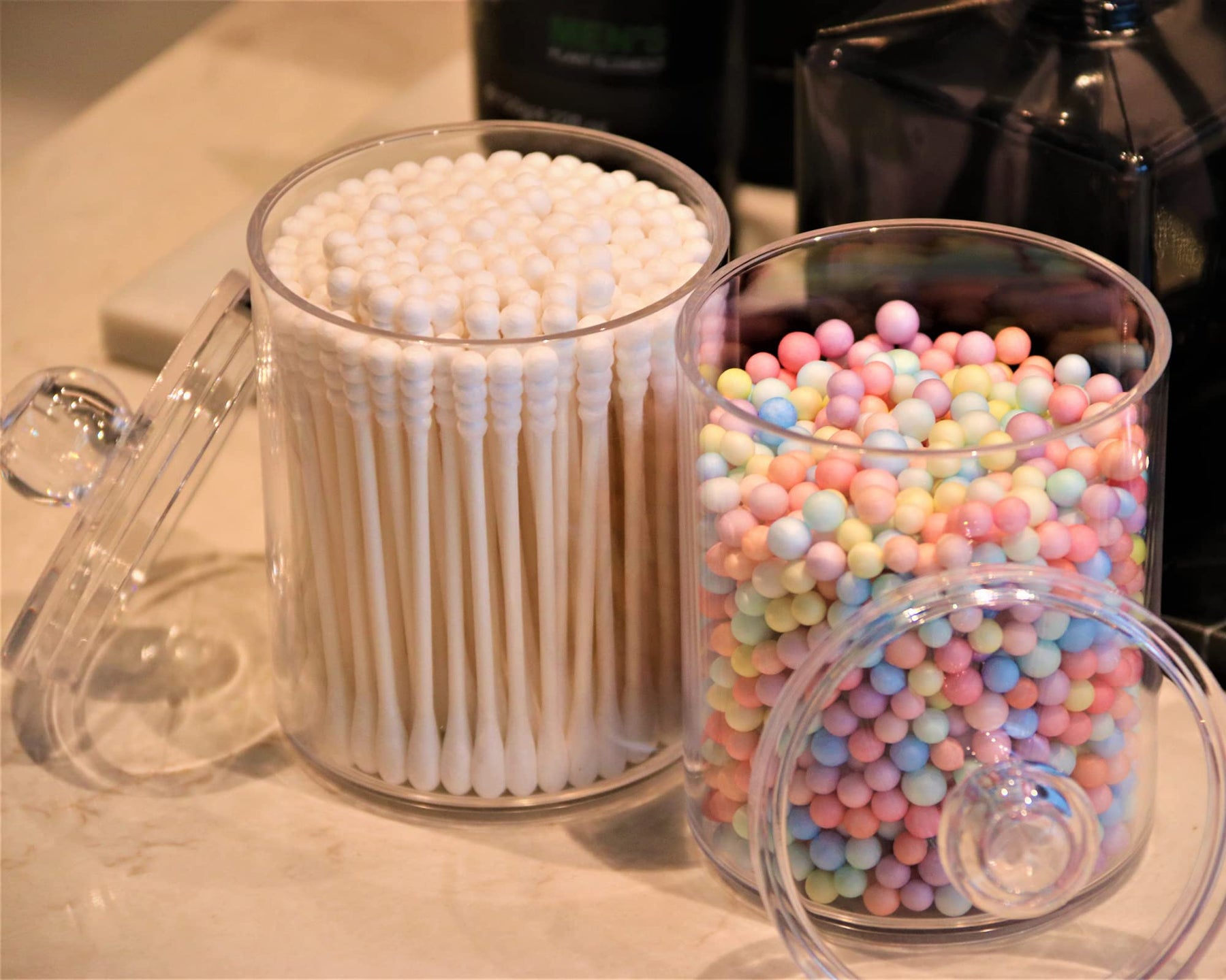 - Ideal size storage canisters, perfect organizer for small objects, quite easy to store and take out, such as Q-tip, cotton ball, cotton swab, cotton rounds, floss picks, bath salts, hair tie band,candy, clip, rubber bands and more small item.