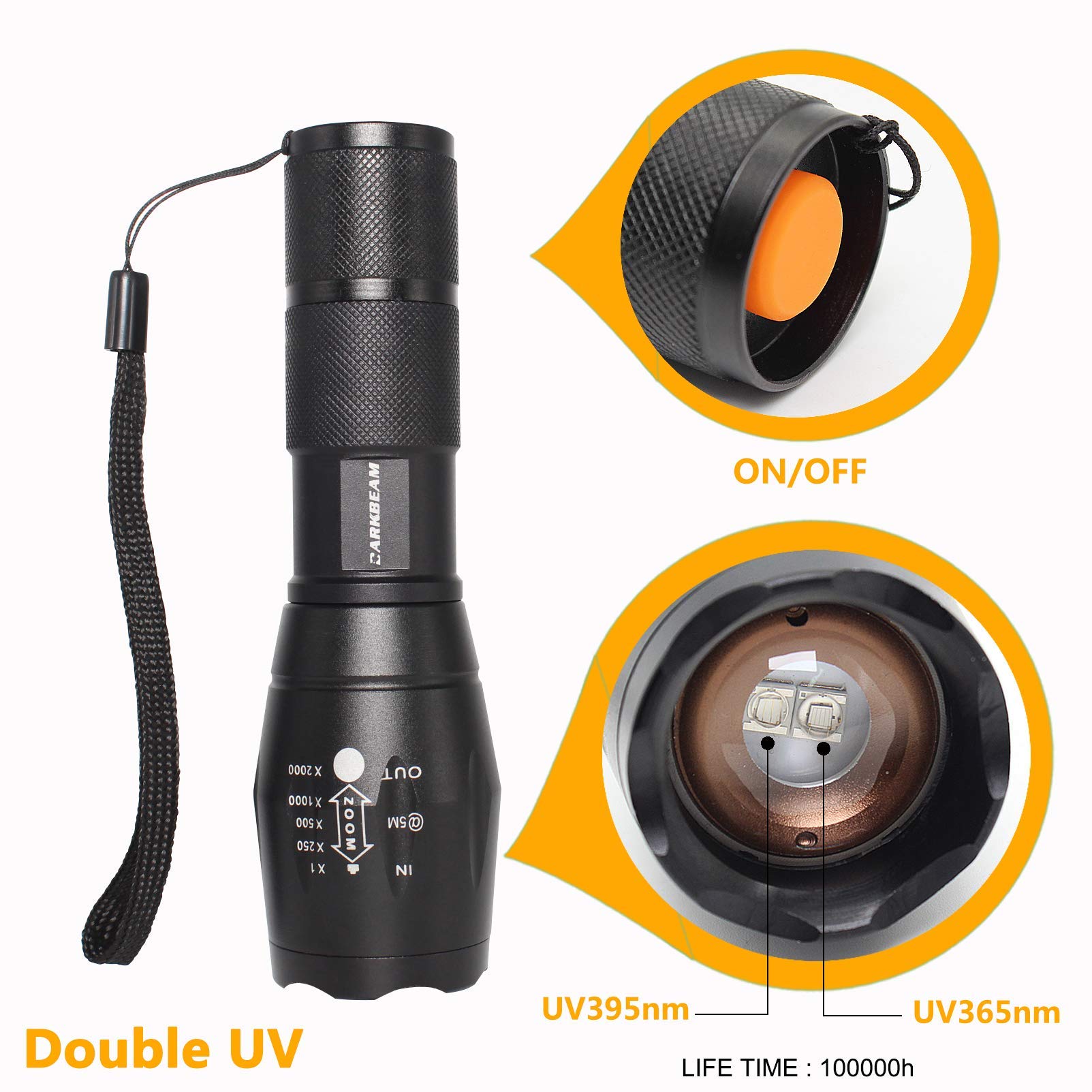 - ADJUSTABLE FOCUS & WATERPROOF BLACKLIGHT-- The A100 395nm & 365nm has the feature of telescopic adjustment focus, it allows to cover a larger area. Nice for revealing dry dog urine, pet cat pee and rodent stains and unfavorable Spots that couldn't see with the Naked Eye. IPX4 Waterproof Rating, it can still be used in rainy days. WARRANTY!We stand strongly behind Your satisfaction. Any question will be solved (free refund/ replacement) if you contact DARKBEAM.