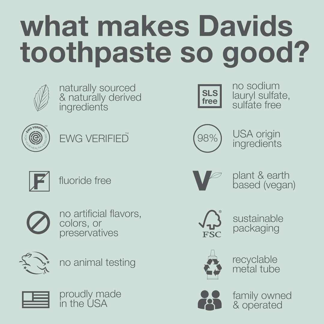 - Fluoride-Free Toothpaste: Davids replaces fluoride and other common toothpaste chemicals with high-performing ingredients to effectively reduce plaque, naturally whiten, and freshen breath.