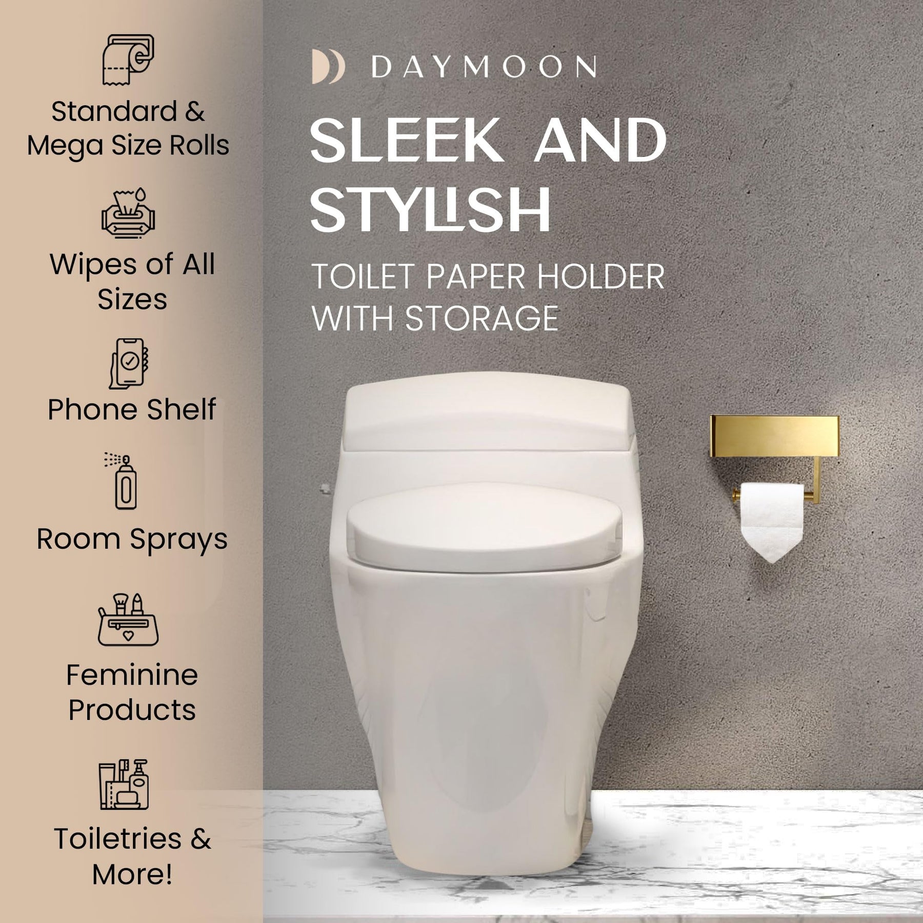 - Original Toilet Paper Holders – Day Moon™ Brushed Gold Toilet Paper Holder with Shelf, Wipe Holder for Bathroom Flushable Wipes Dispenser Toilet Paper and Wipes Holder, Toilet Paper Holder with Storage Toilet Paper Holder Wall Mount by Day Moon Designs