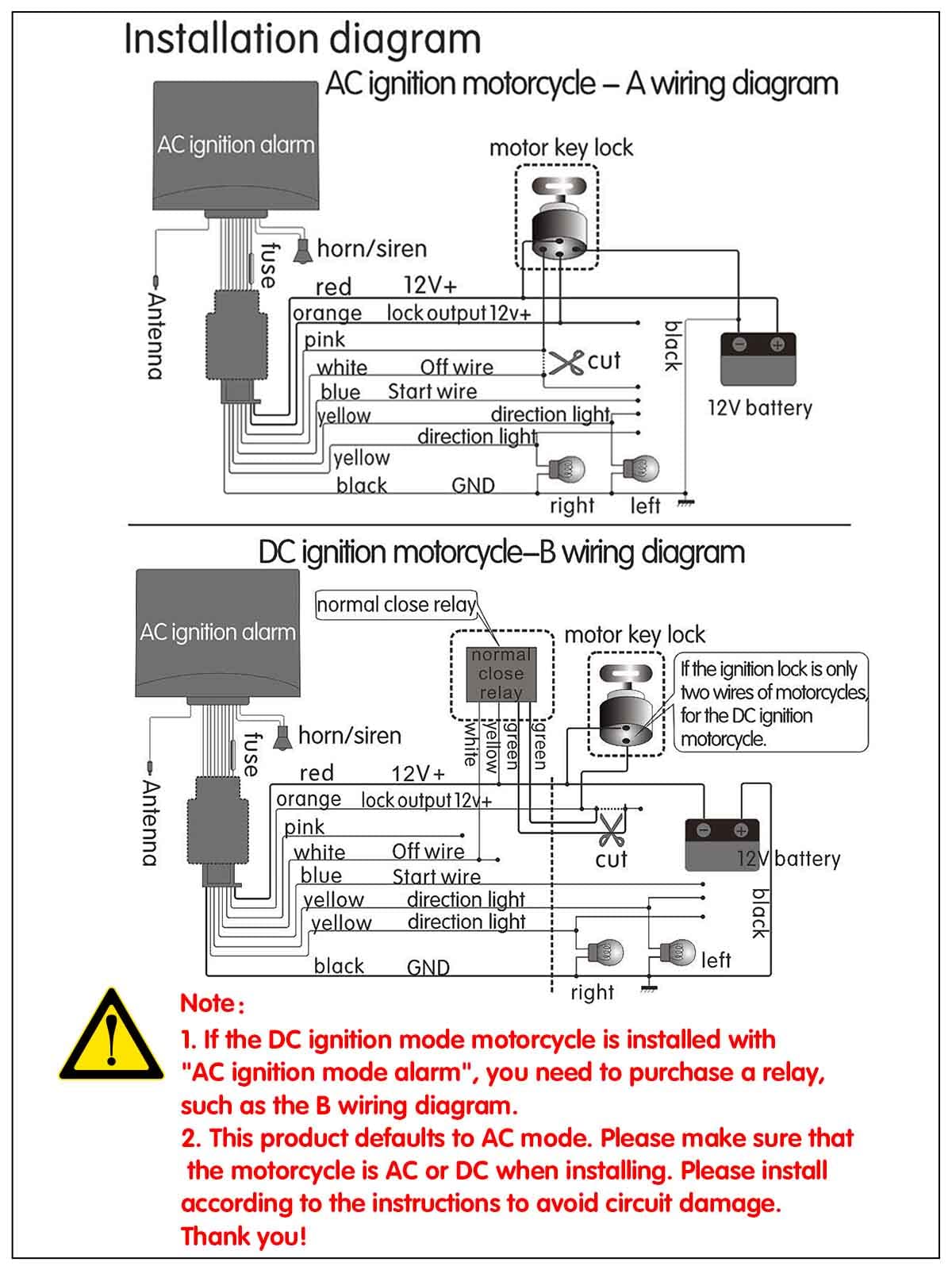- Note: 1. If the DC ignition mode motorcycle is installed with AC ignition mode alarm, you need to purchase a relay, such as the B wiring diagram. 2. This product defaults to AC mode. Please make sure that the motorcycle is AC or DC when installing. Please install according to the instructions to avoid circuit damage.
