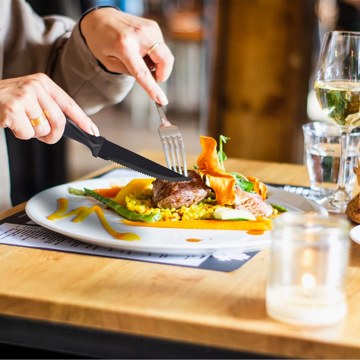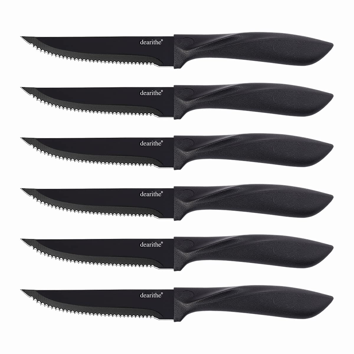 - Original Steak Sets – Steak knives set of 6, Black Serrated Stainless Steel Sharp Blade Flatware Steak Knife Set, 4.5 Inches,Non stick coating for Anti-rusting, for Restaurant Tableware Kitchen Camping by dearithe