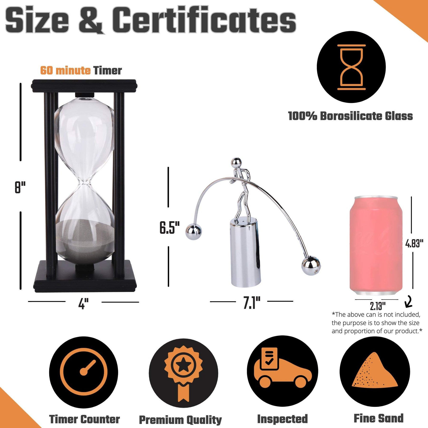 - Includes Relaxing Motion Swinging Sticks Desk Toy – Our exclusive Hourglass Timer bundle includes 1 Large 60 minute hourglass with sand and 1 stress-relief Balance Motion Desk Toy. Budgetizer hour glass with sand is ideally sized measuring (8”H x 4”W) inches and the perpetual motion physics desk toys measure (7.1”H x 6.5”W) inches.