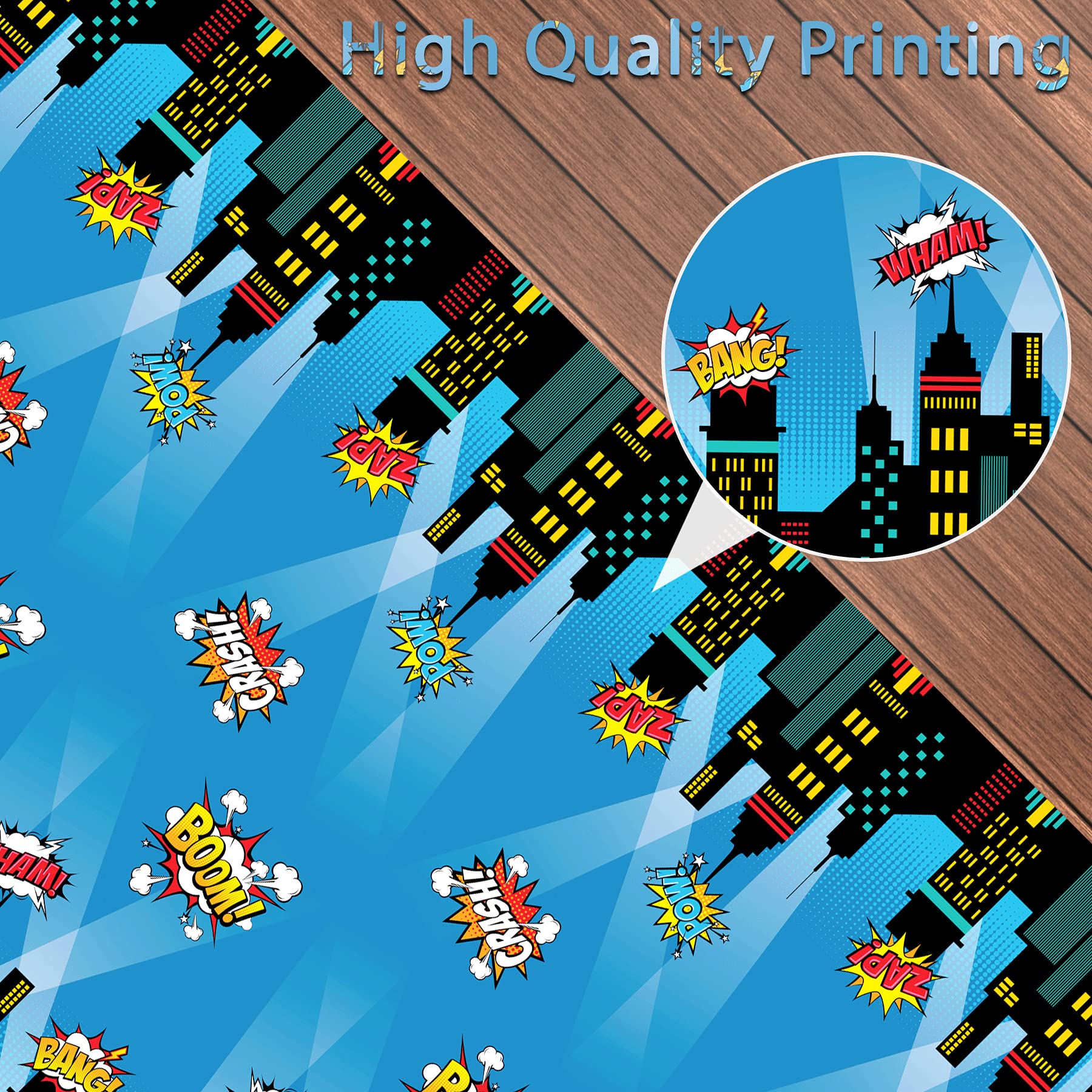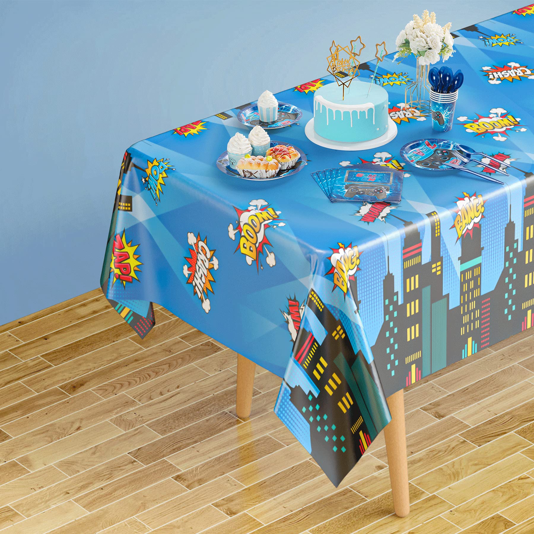 - Get Into Superhero Action The fun superhero table cloths for parties features a bright blue background with explosive phrases, like wham, bang, and boom!. It will wow your guests and make your party full of vitality.