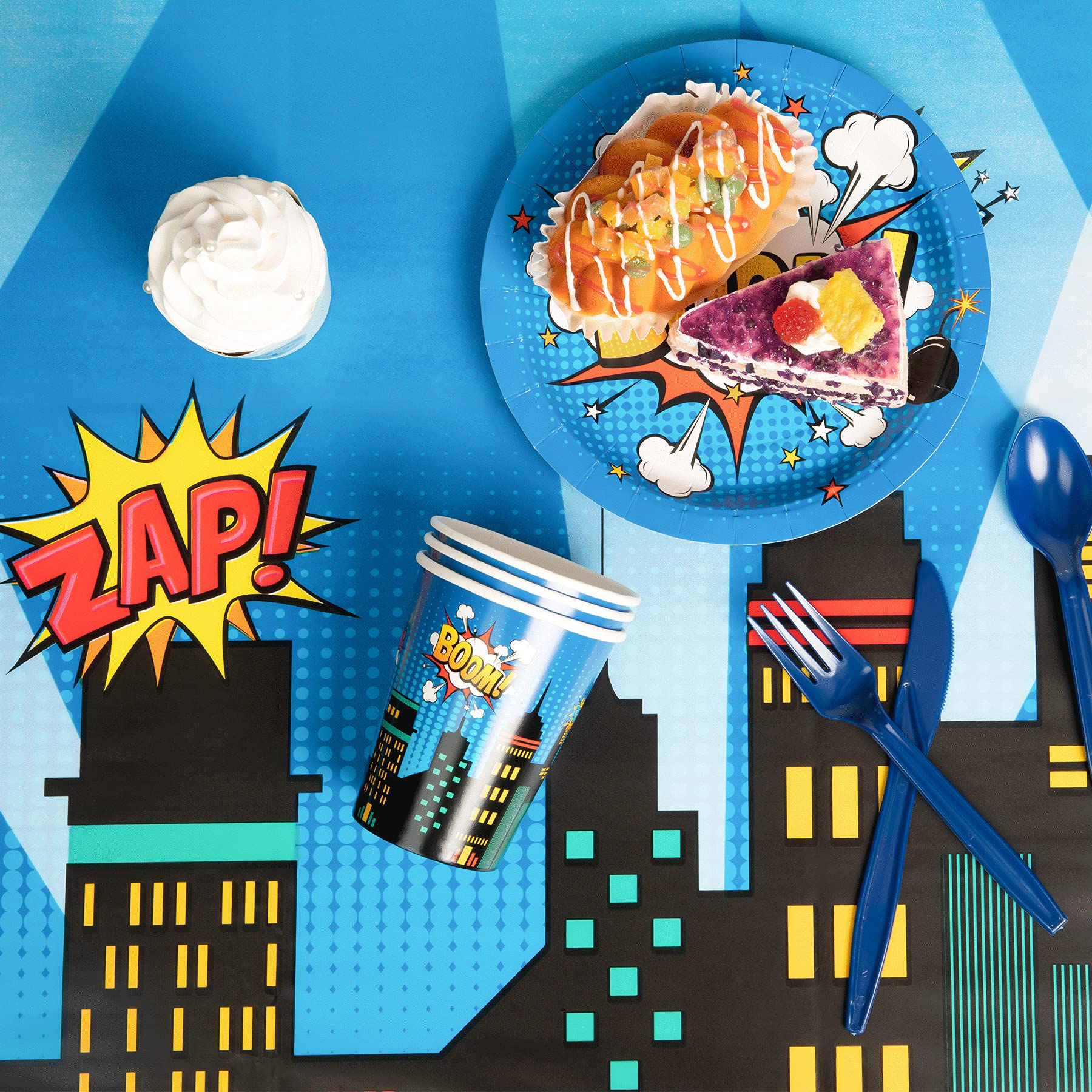 - Wide Occasions The superhero party tablecloth is great for superhero-themed party, birthday party and baby shower. Also it is a perfect complement to superhero party table decorations and will make your table settings super colorful!
