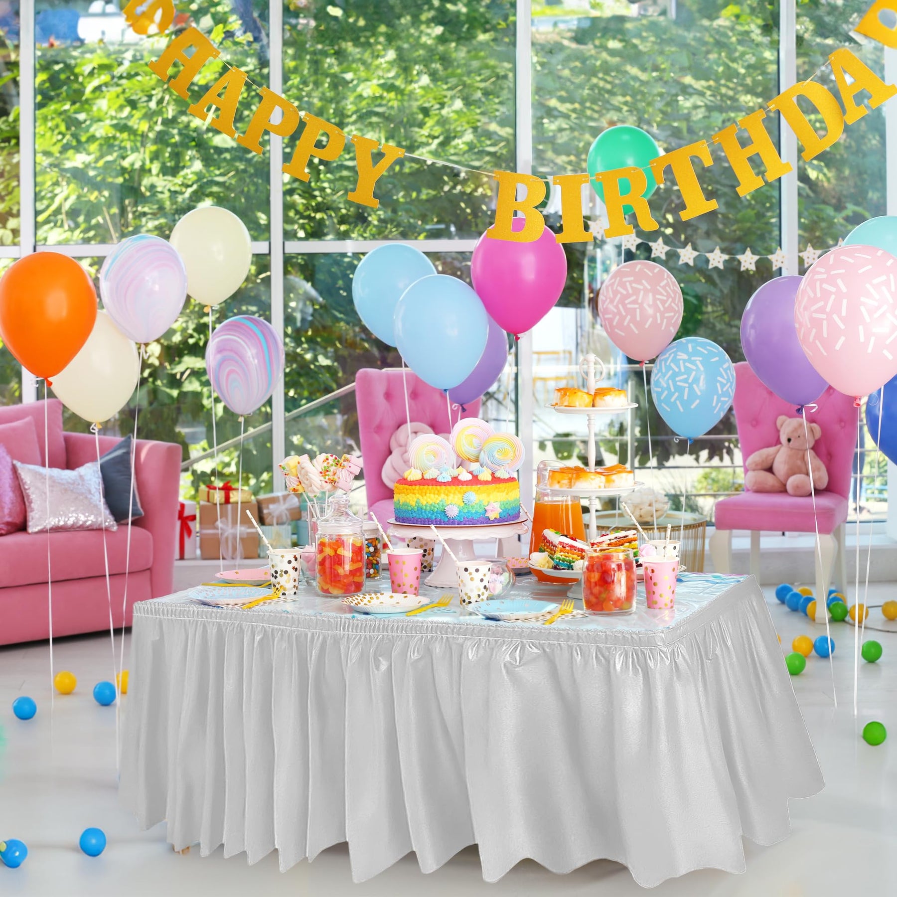 - : 29-inch x 14 ft (73 cm x 4.26 m) Made from BPA-free plastic, these table skirts are food-safe and easy to wipe down, maintaining both safety and style. Their high-quality plastic construction makes them a reliable choice for everyday use, outdoor dining, and beyond.
