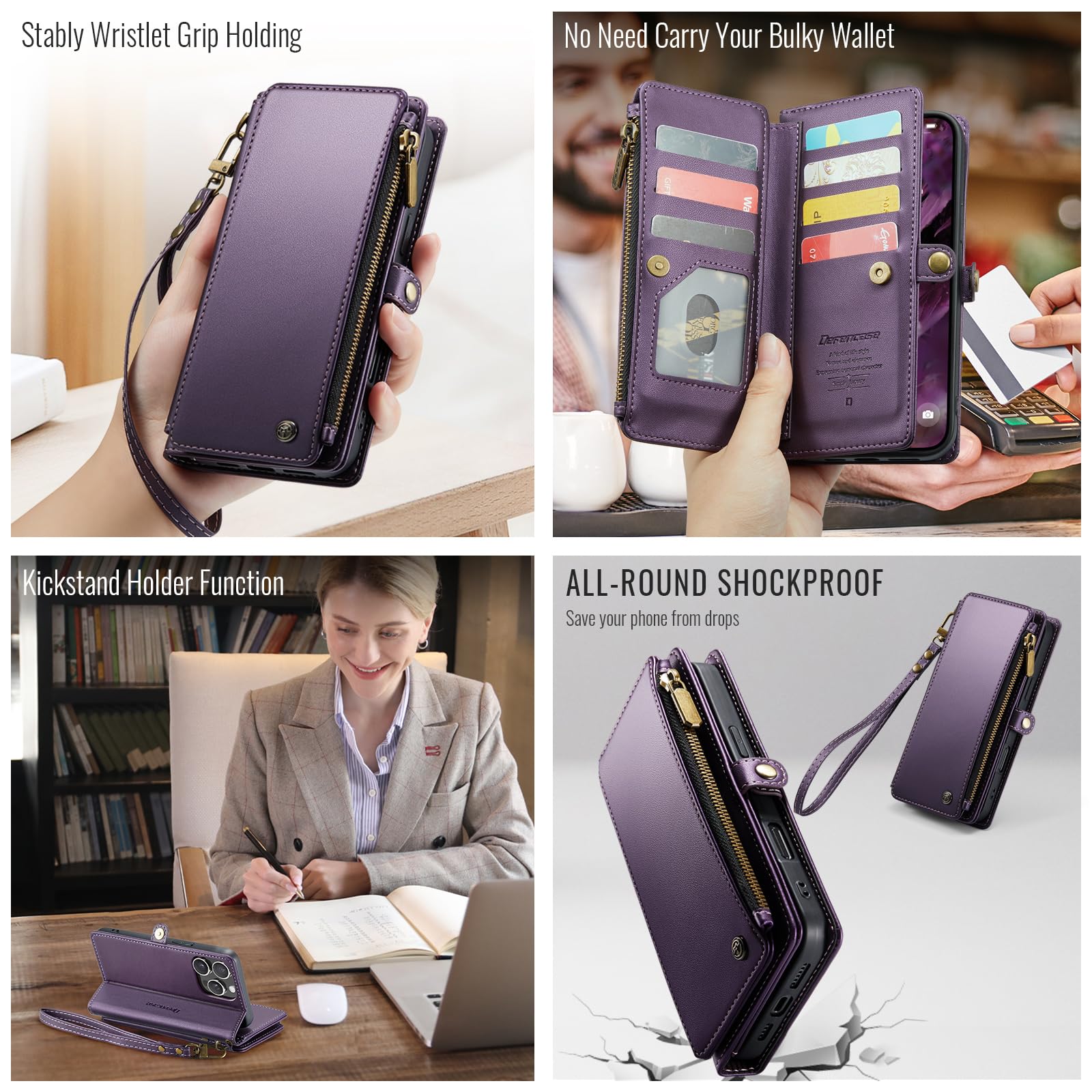 - 4.Rfid Blocking Card Slots & Zipper & Wristlet: Includes rfid blocking 10 card holder + 1 zipper bag + 1 cash slots,hold your ID,credit cards,driver license,bills,coins and a little bit cash without problems. The zipper has been tested more than 5000 times; With a removable wrist strap, providing a optional griping method