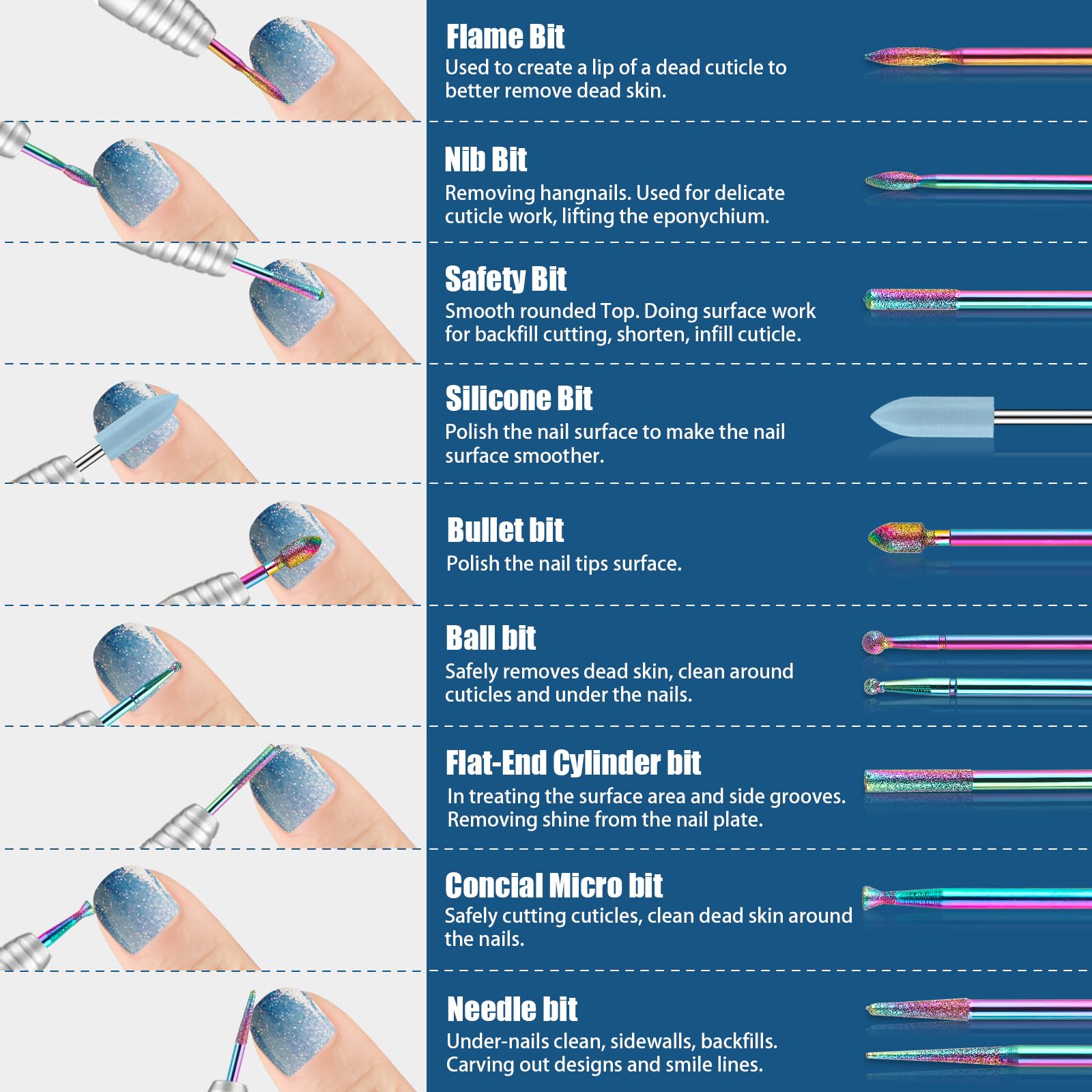 6pcs Special Under Nail Cleaner(UNC) Bits: Used to clean sidewall and under the nail. Some professionals also use this to make a designer hole.