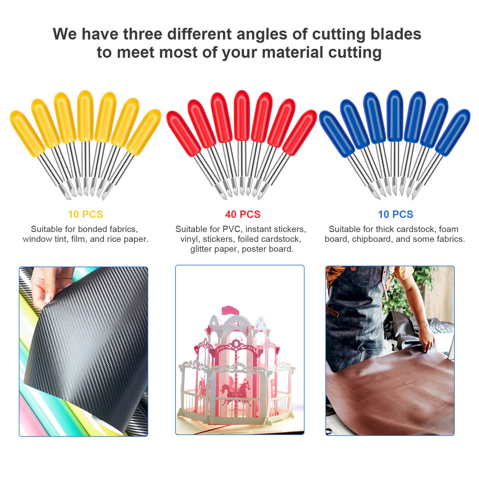 - PACKAGING-50PCS replacement cutting blades stored in a small delicate box, including 10PCS 30 degree vinyl cutting replacement blades (yellow cap) + 30PCS 45 degree standard blades (red cap) + 10PCS 60 degree deep cutting (blue cap).