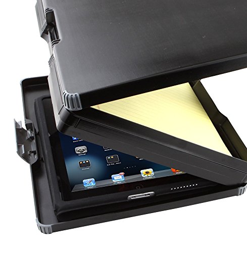 - Front case features a smooth writing surface, metal clip and large compartment for notepads, electronic tablets