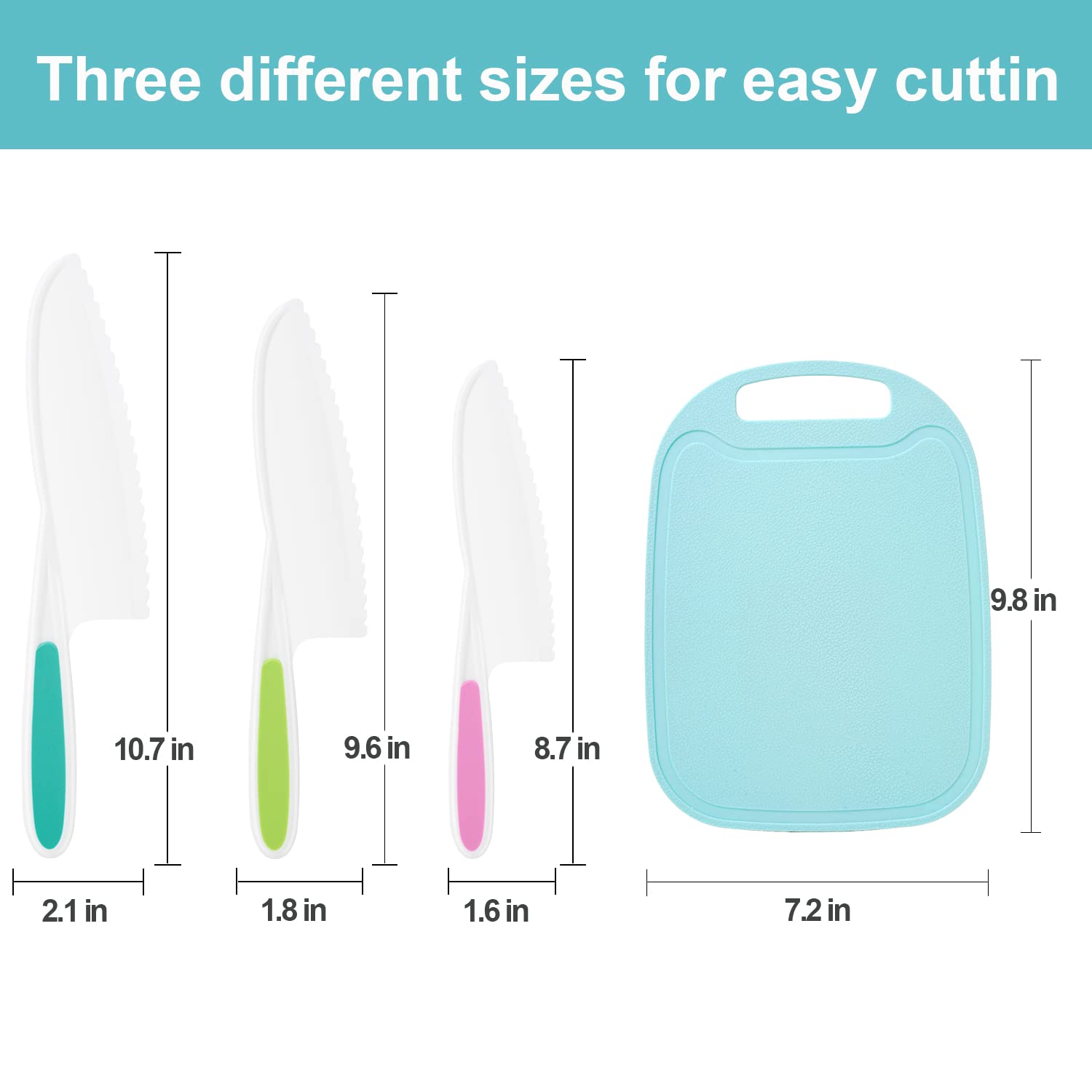 - Original Kids' Baking Supplies – Kids Knife 4-Piece with Cutting Board - Toddler Knife Set Children's Cooking Nylon Knives - Serrated Edges and Firm Grip Suitable for Cutting Salad, Fruit, Cake, Lettuce (3 Sizes & Colors) by DIKAKO