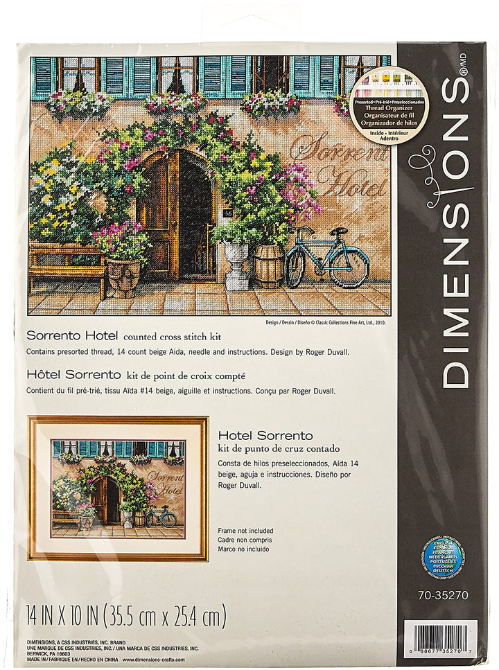 - Sorrento Hotel cross stitch kit includes 14 count beige Aida, presorted cotton thread, needle, and instructions.
