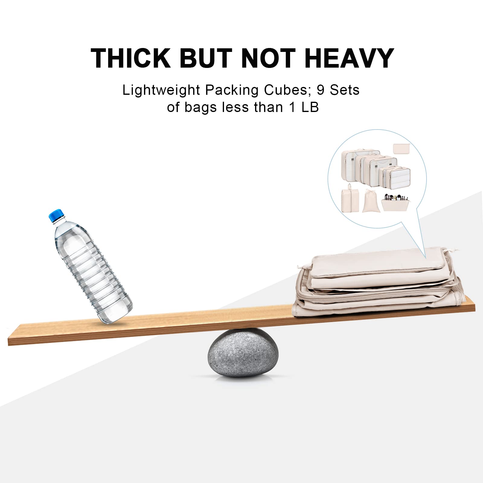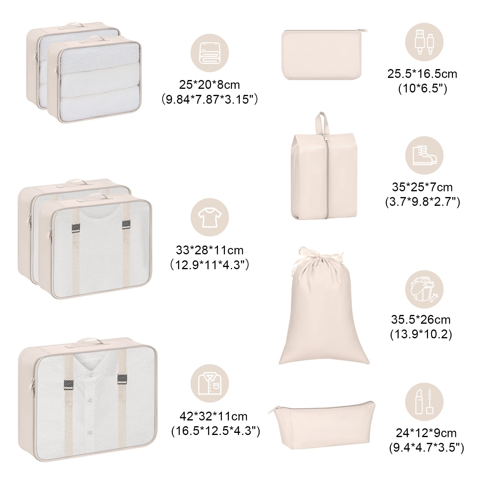 - Multiple Usage: 3 single travel cubes for clothes + 1 cube for underwear + 2 waterproof drawstring bags for shoes and cosmetic + 1 cable bag for USB cable, earphones + 1 small bags for socks, coins, pens, keys etc.