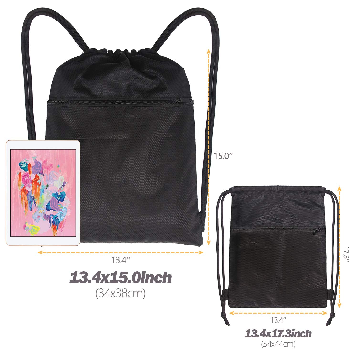 - The drawstring backpack with zipper large pocket compartment measures 13.4 x 11.8 which is big enough for mobile phone, wallet, cups, small umbrella or other items.