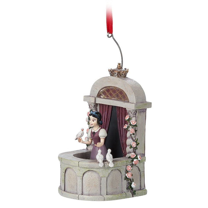 - Fully sculpted ornament includes Snow White and feathered friends on balcony setting