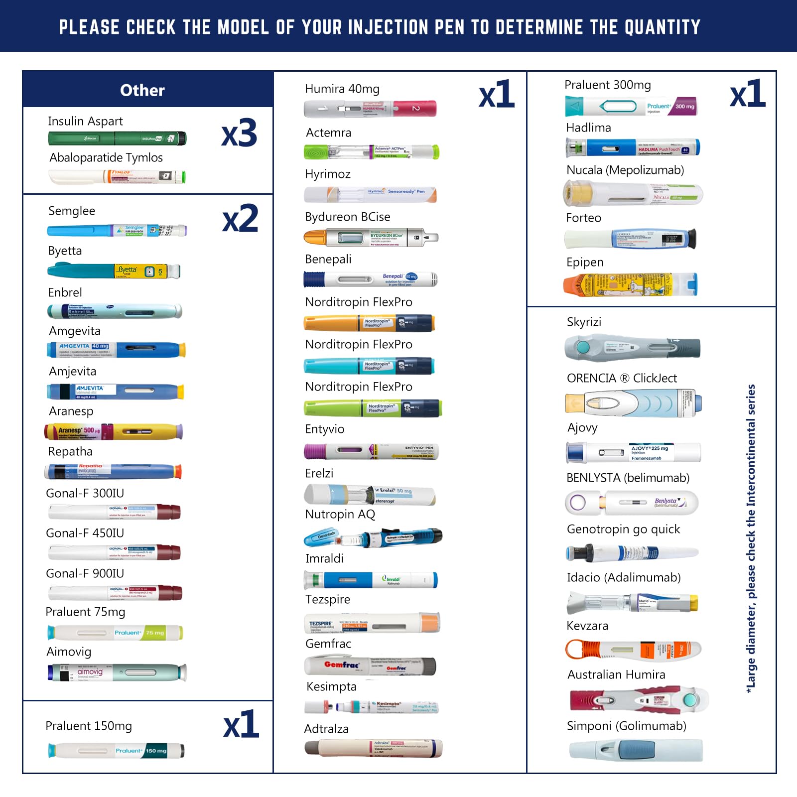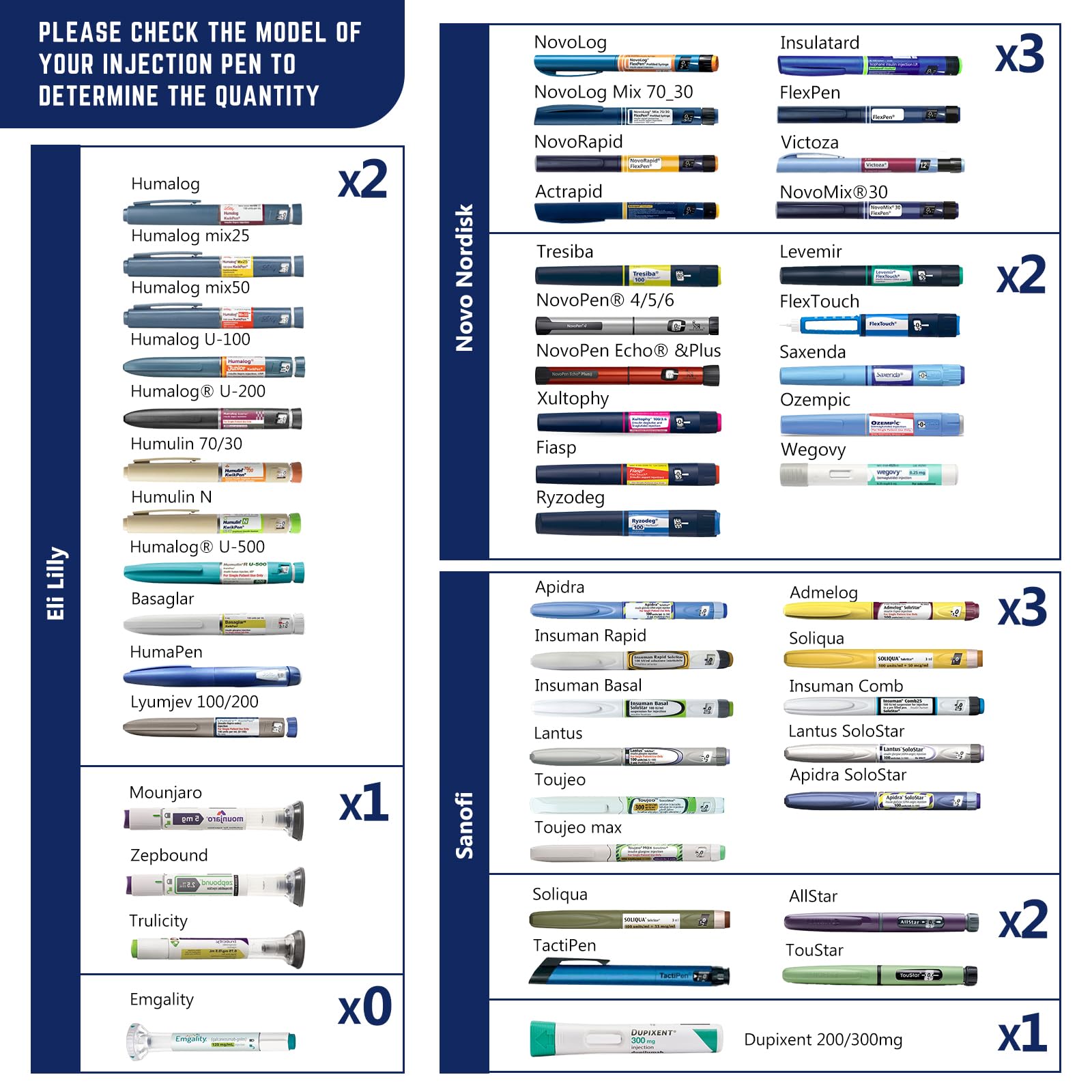 - How many injection pens can I put in : We have obtained the sizes of 95% of the common brands of injection pens on the market and made a detailed capacity reference chart. 1)You can find a table on our page for reference to buy the right cooler. 2) If you can't find your injection pen model, please be sure to contact us, we will be happy to help you solve your problem