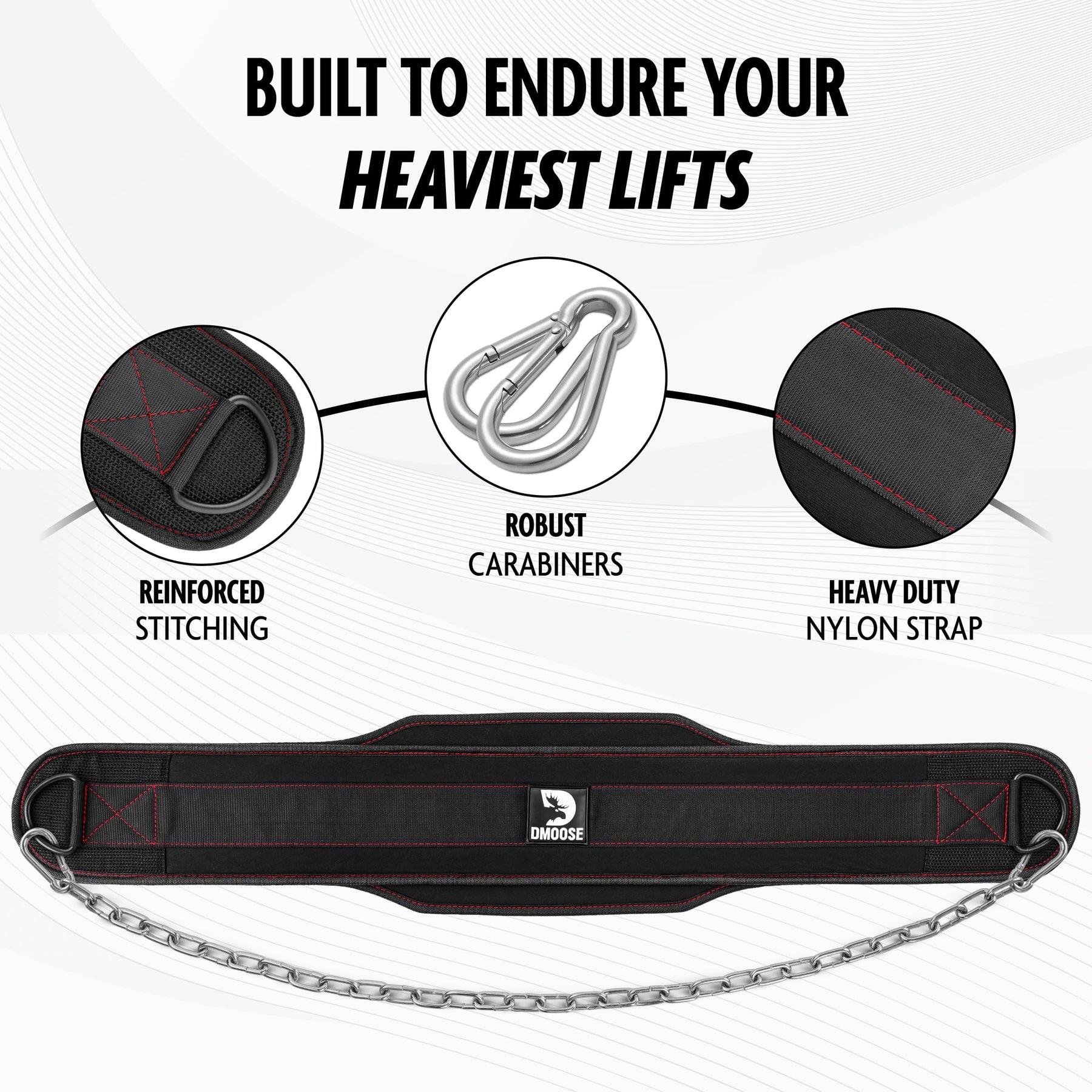 - : Equipped with a heavy-duty, robust steel chain, the DMoose Weight Belt with Chain & thick padding can support up to 350 lbs of added weight. This strong chain ensures secure attachment of plates or kettlebells, providing the stability and confidence you need to tackle your heaviest lifts. Enhance your training intensity and muscle growth with this reliable and durable pull up weight belt.