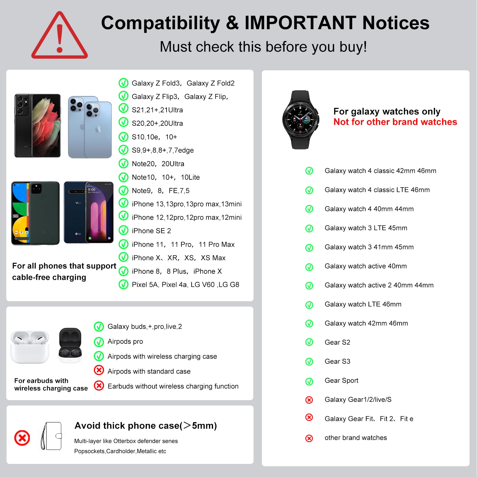 - Universal Compatibility This wireless charger is compatible with Samsung Galaxy S23 Ultra/S22/Z fold 3/Z Flip 3/S21/S20/S10/S10+/Note10/S21 FE, Samsung Earbuds:Galaxy Buds/Buds+/Buds Pro,etc. , Fit for Samsung Galaxy Watch 7/6/5/4 (40/44mm), Watch 4 Classic (42/46mm), Galaxy Watch 1/3, Samsung Galaxy Watch Active1/2, Samsung Gear S3/4, Gear Sport;