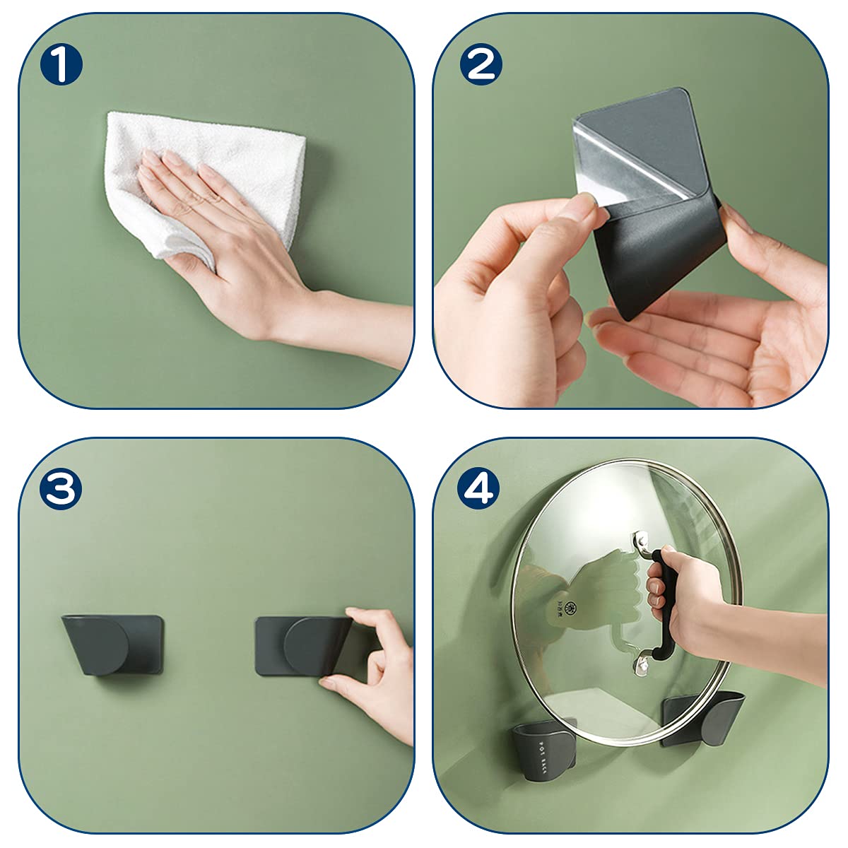 - Easy to use:You only need to tear off the film of the bracket and stick it on any clean wall.No need to drill for installation, simple operation.Paste different widths according to requirements, suitable for hanging all sizes of lids.