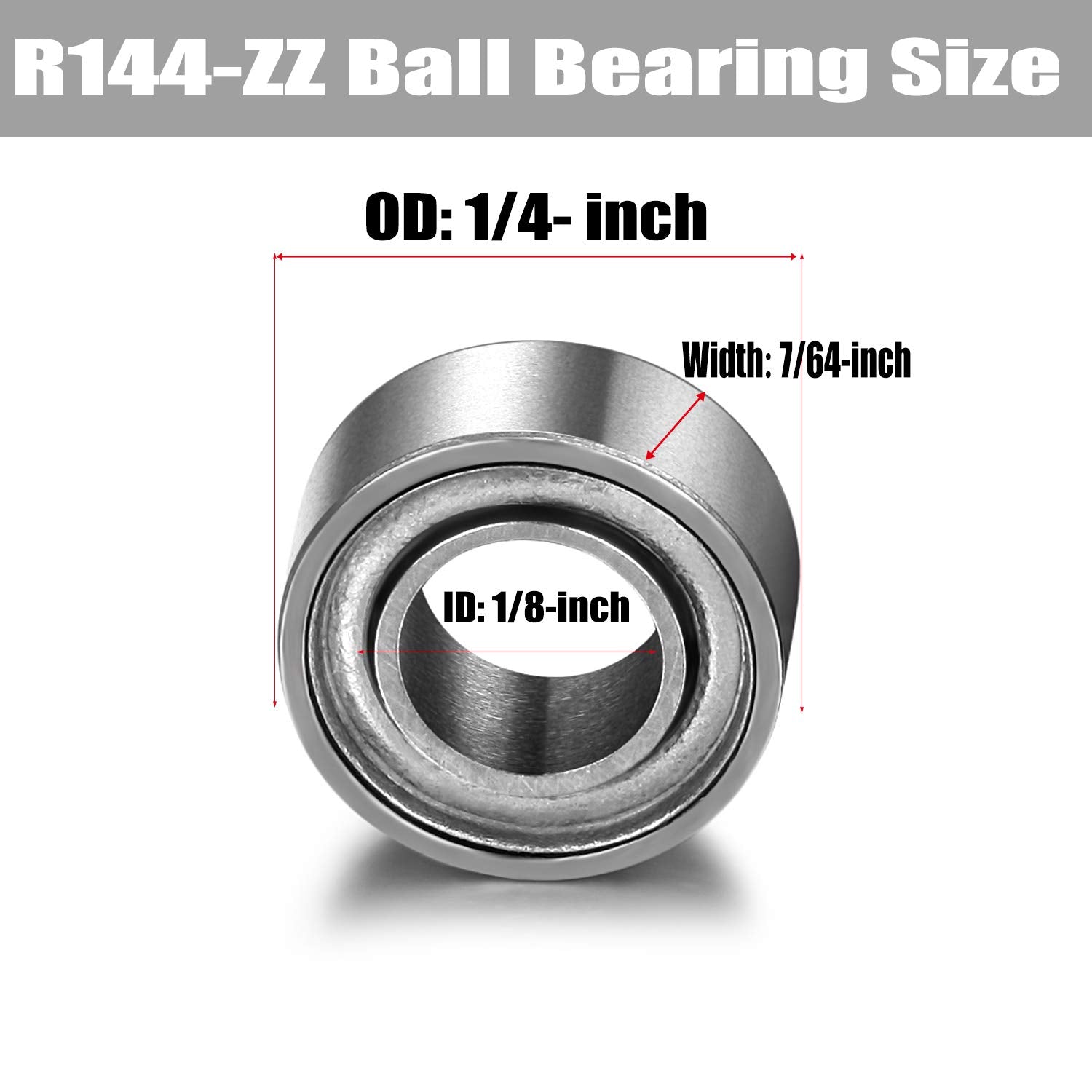 - R144-ZZ Bearing Sizes: ID: 1/8 x OD: 1/4 x Width 7/64. The high accuracy of the bearings enables excellent high-speed performance.
