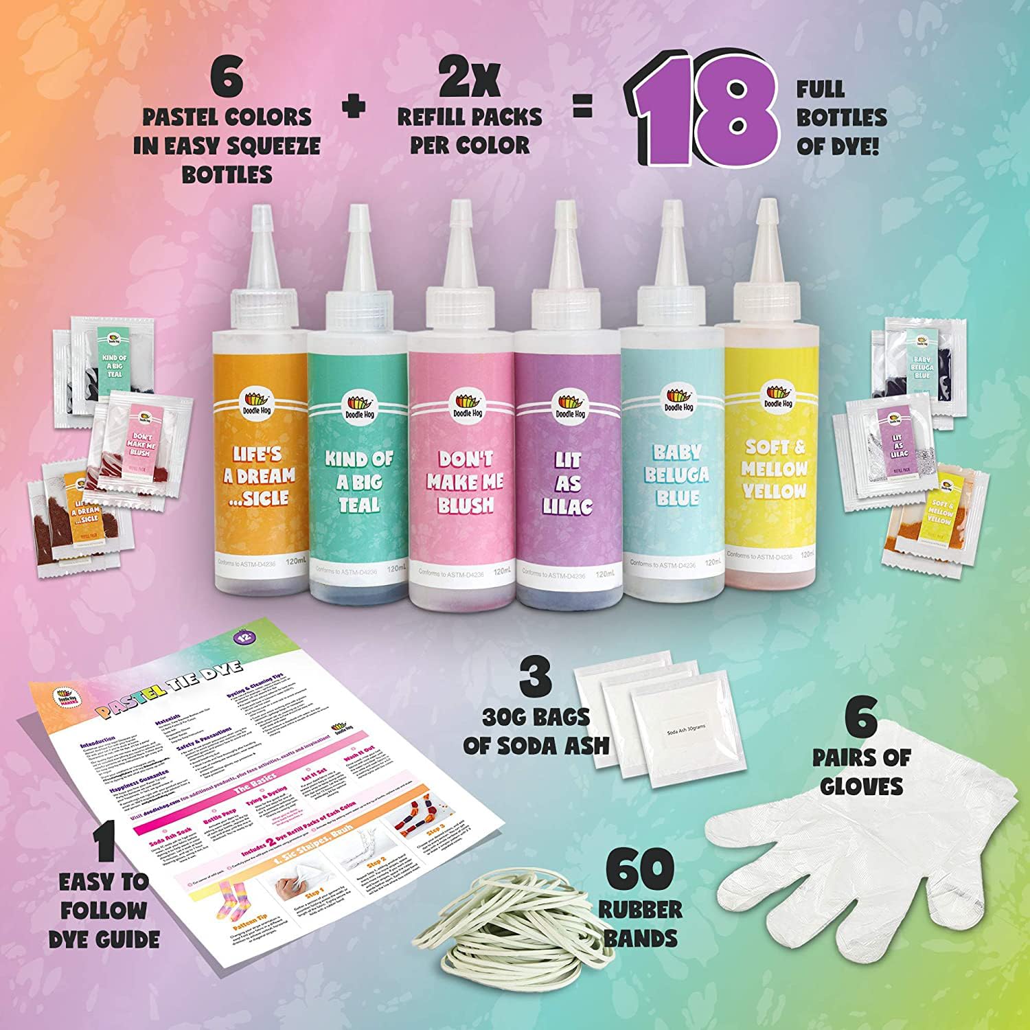 - VIBRANT PASTEL COLORS: Our Pastel Tie Dye Kit includes 6 custom pastel fabric dyes, 2 dye refill packs of every color (18 bottles total), and 3 bags of soda ash, making it a good tye dye kit to go for endless creativity