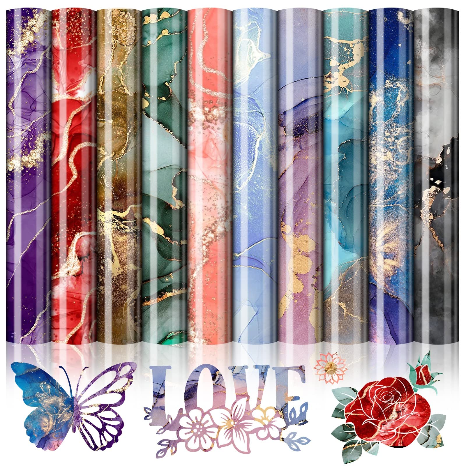 - Marble Heat Transfer Vinyl: Come with 10 sheets different color marble pattern htv, each marble permanent vinyl measures 10 x 12 inch/ 25 x 30 cm, enough quantity and proper size for you to DIY T-shirts, shoes, hats, bags, pillows, etc. (Please note the surface without glitter)