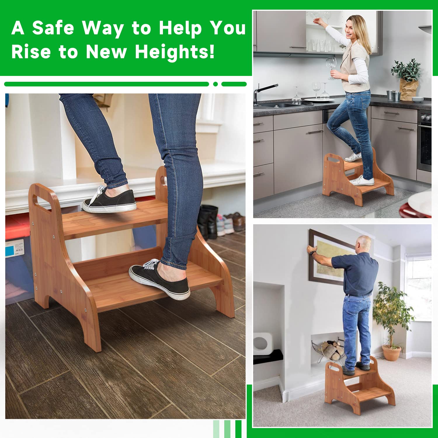 - Smooth, Waterproof, No Smell & No BurrsDORPU step stools crafted with natural bamboo material and quality craftsmanship. The fully varnished surface makes this adult step stool smooth, waterproof and easy to clean. Quickly clean with just a wiping of a towel. Rounded corners have no burrs and is pretty comfortable to touch. The large O-rings handles will protect your hands and be portable.