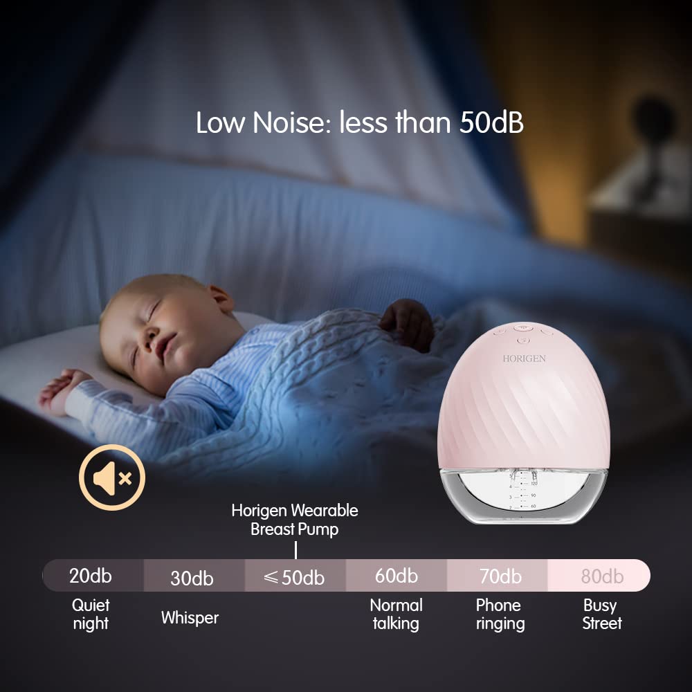 - Low Noise - The sound of Horigen wearable portable breast pump is less than 50 dB when working and will not disturb a sleeping baby. The cordless hands-free breast pump is convenient for mom to use anytime. There is a bra adjustment buckle come with the wearable pump which helps mother to wear in bra comfortably.