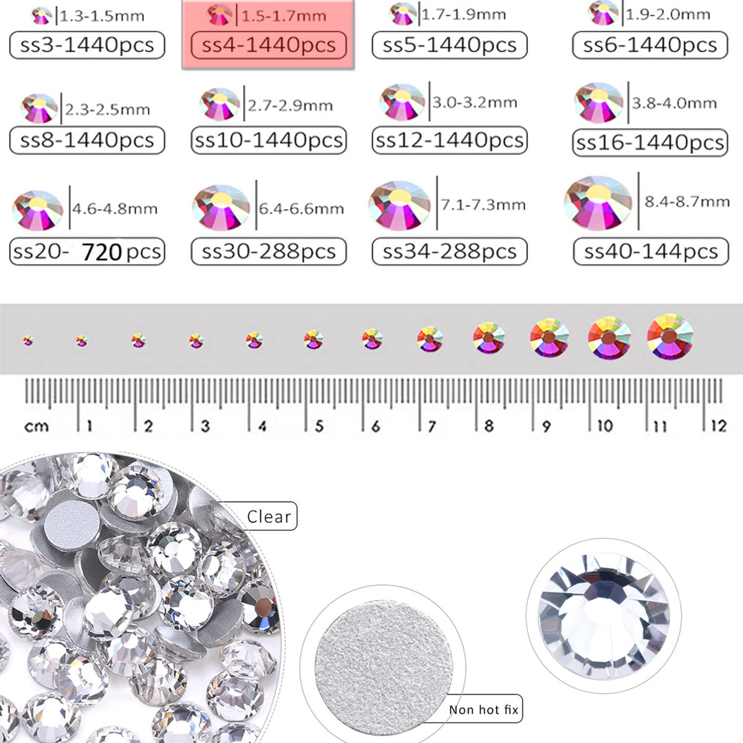 - Size and Quantity: These SS4 flatback rhinestones are tiny, with diameter 1.5 mm, you will receive 1440 Pieces. They are swarovski alternative premium quality flatback rhinestones, ideal for nail art