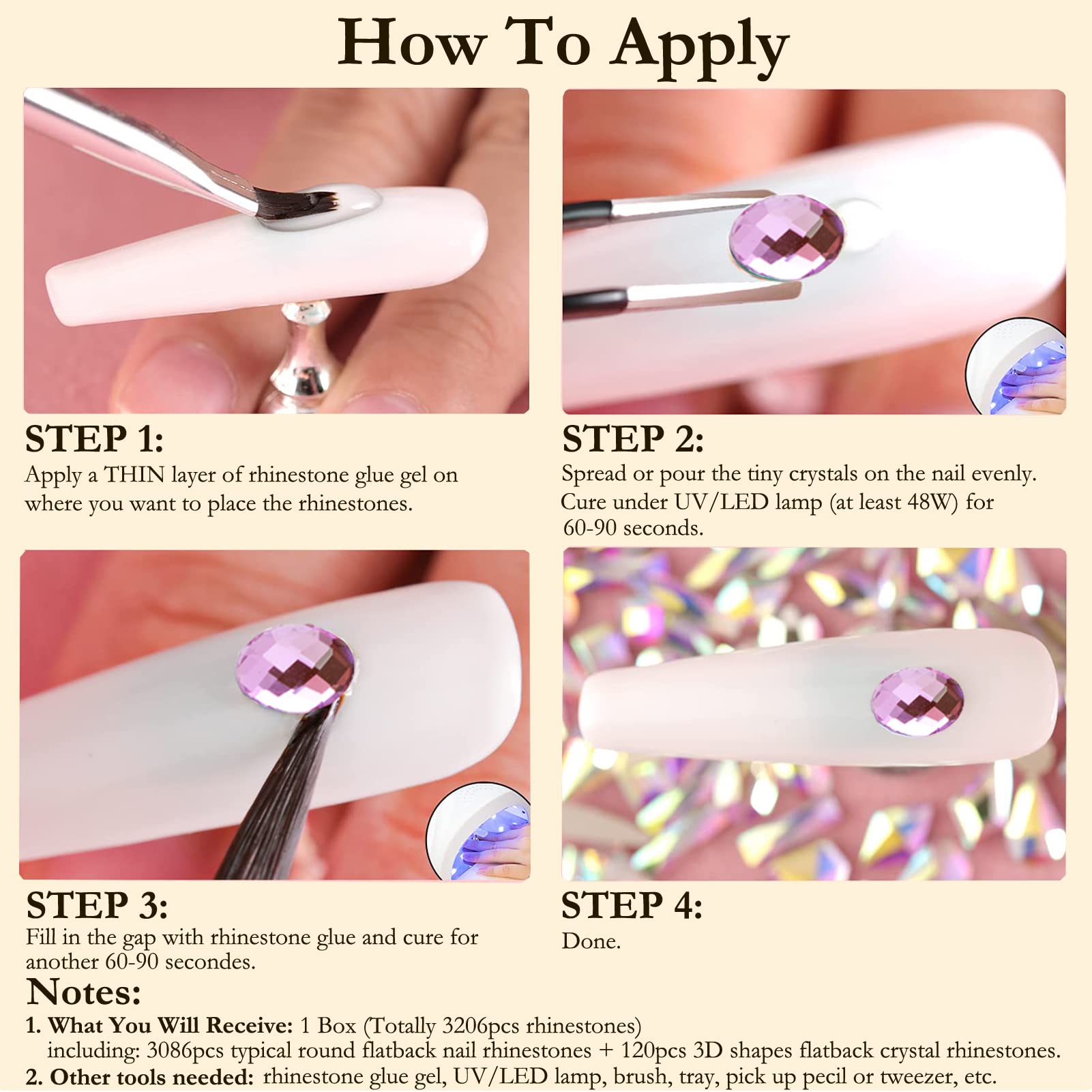 - What You Will Receive: 1 Box (Totally 3206pcs rhinestones), including: 3086pcs typical round flatback nail rhinestones + 120pcs 3D shapes flatback crystal rhinestones. All rhinestones are made from high quality glass crystals, which is pure, solid and transparent.