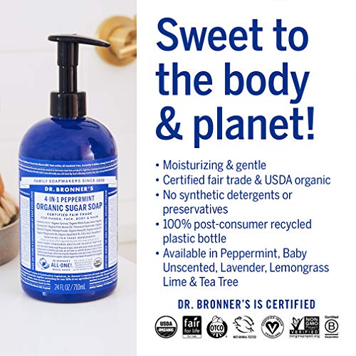 - Original Soaps – Dr. Bronner's - Organic Sugar Soap (Peppermint, 24 Ounce) - Made with Organic Oils, Sugar & Shikakai Powder, 4-in-1 Uses: Hands, Body, Face & Hair, Cleanses, Moisturizes & Nourishes, Vegan by Dr. Bronner's