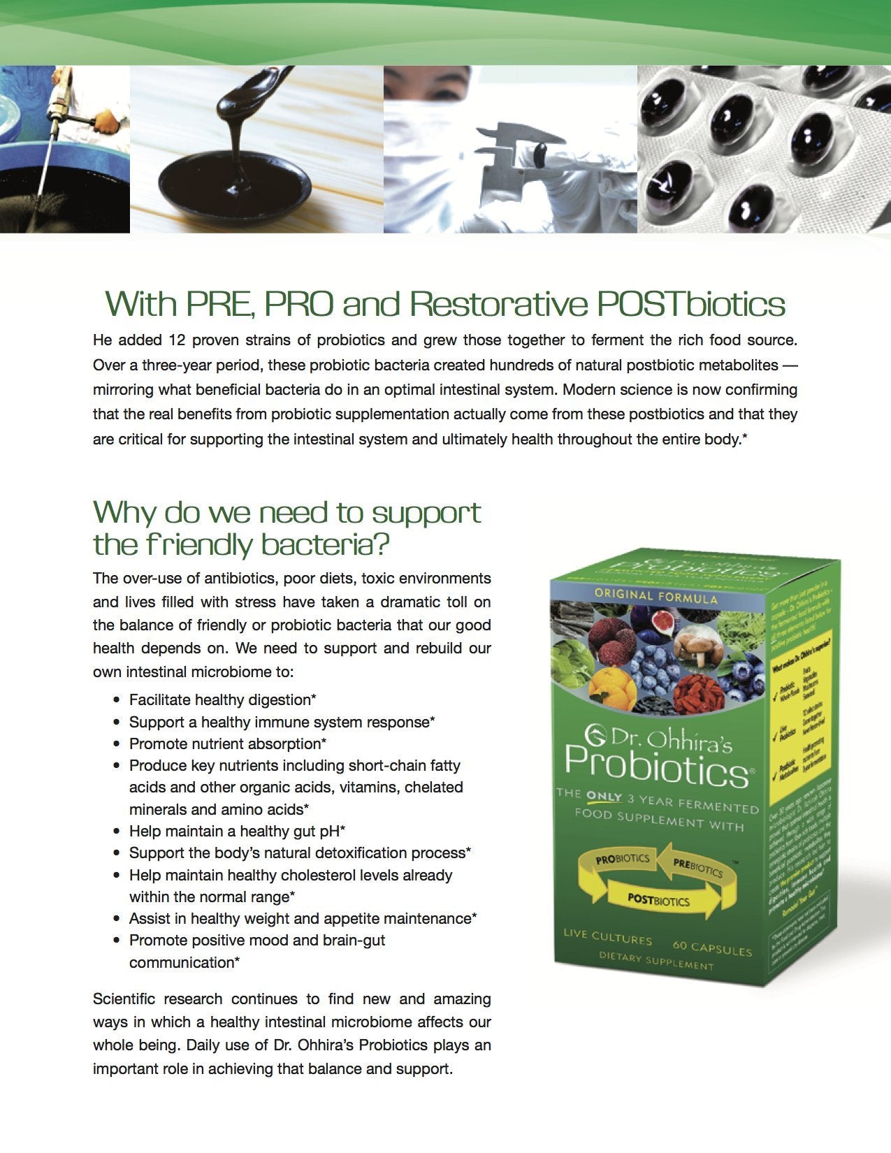 - AN ALL NATURAL, SUPERIOR PROBIOTIC developed to support digestive comfort, nutrient absorption and a healthy immune system for men and women. Dr. Ohhiraâ€s Probiotics are not cultured or grown in a laboratory. Ingredients such as mountain spring water, fruits and vegetables – are fermented for three years with 12 distinctive probiotic strains. Fermentation maximizes the natural health-promoting properties of each ingredient, producing a probiotic like no other on the market today.