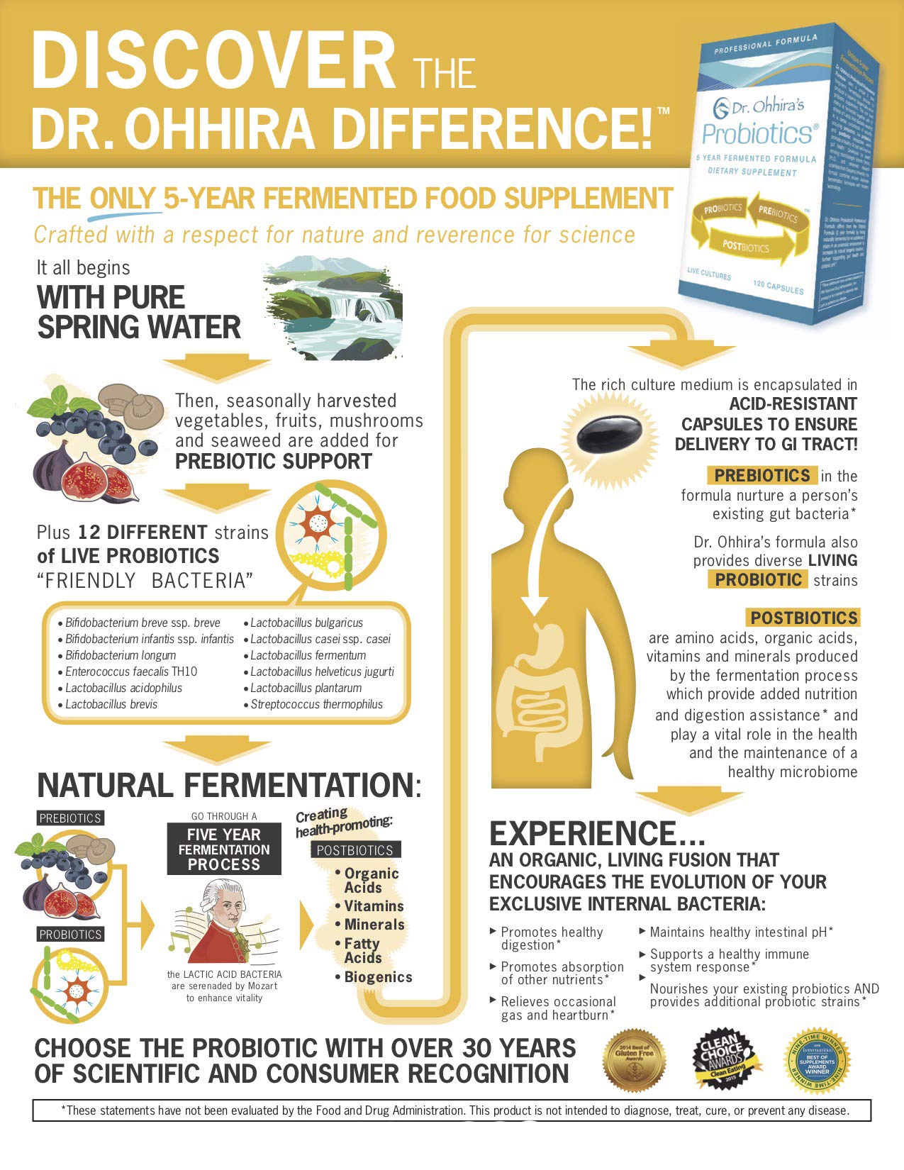 - HIGHEST QUALITY PROBIOTICS that are naturally fermented for five years with all-natural ingredients and 12 different strains of friendly bacteria. Not grown in a lab with a single culture medium, Dr. Ohhira’s process simulates the environment in the human gut. Natural fruits and vegetables are added seasonally to feed the bacteria which the bacteria process and the result at the end of 5 years is strong and effective probiotics and metabolites, what we call postbiotic metabolites.