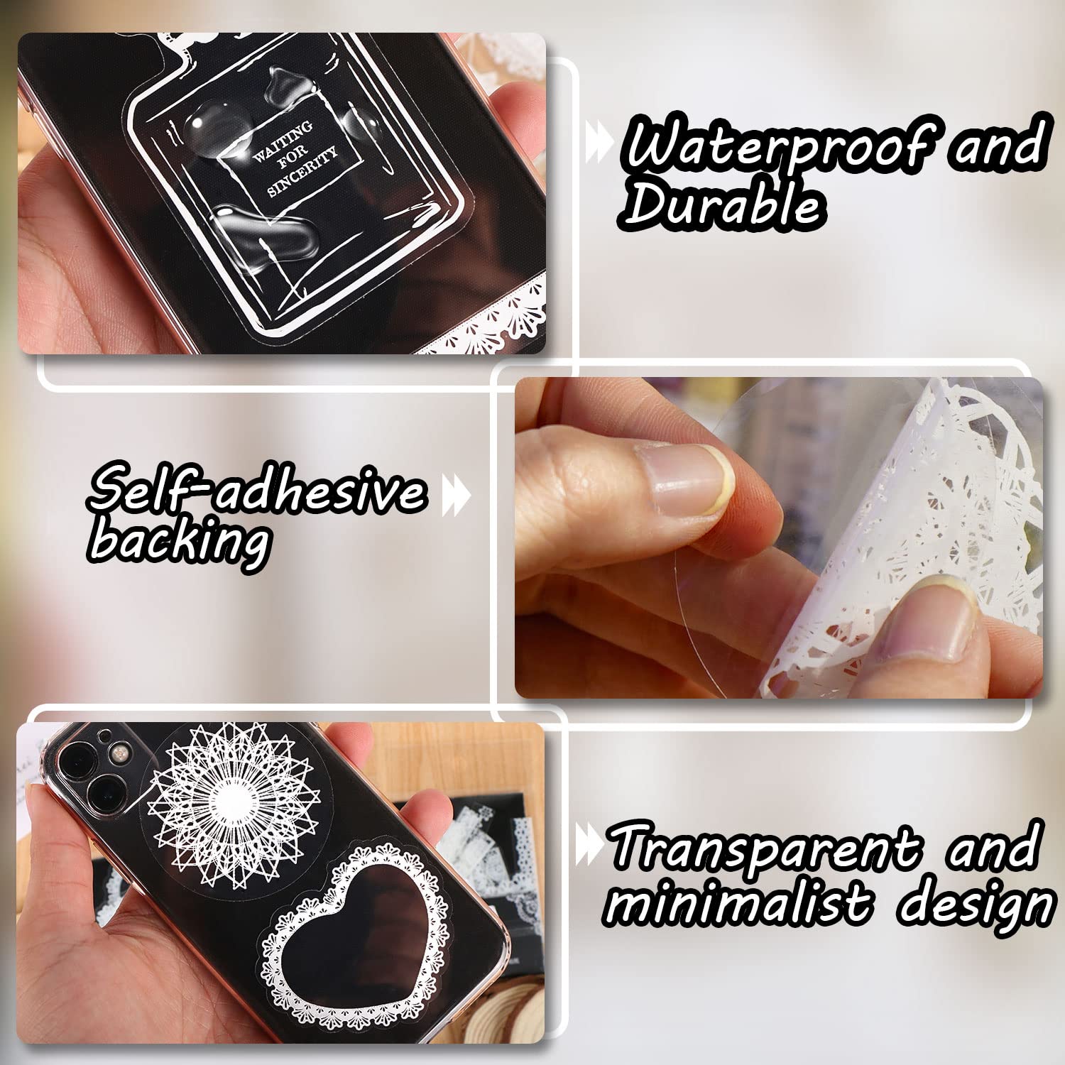 - Diverse Size: The clear bottle shape stickers is approximately 3.54*2.36inch. The Transparent lace sticker is approximately 2.24*2.87inch. Multiple sizes can meet your different decorating needs.