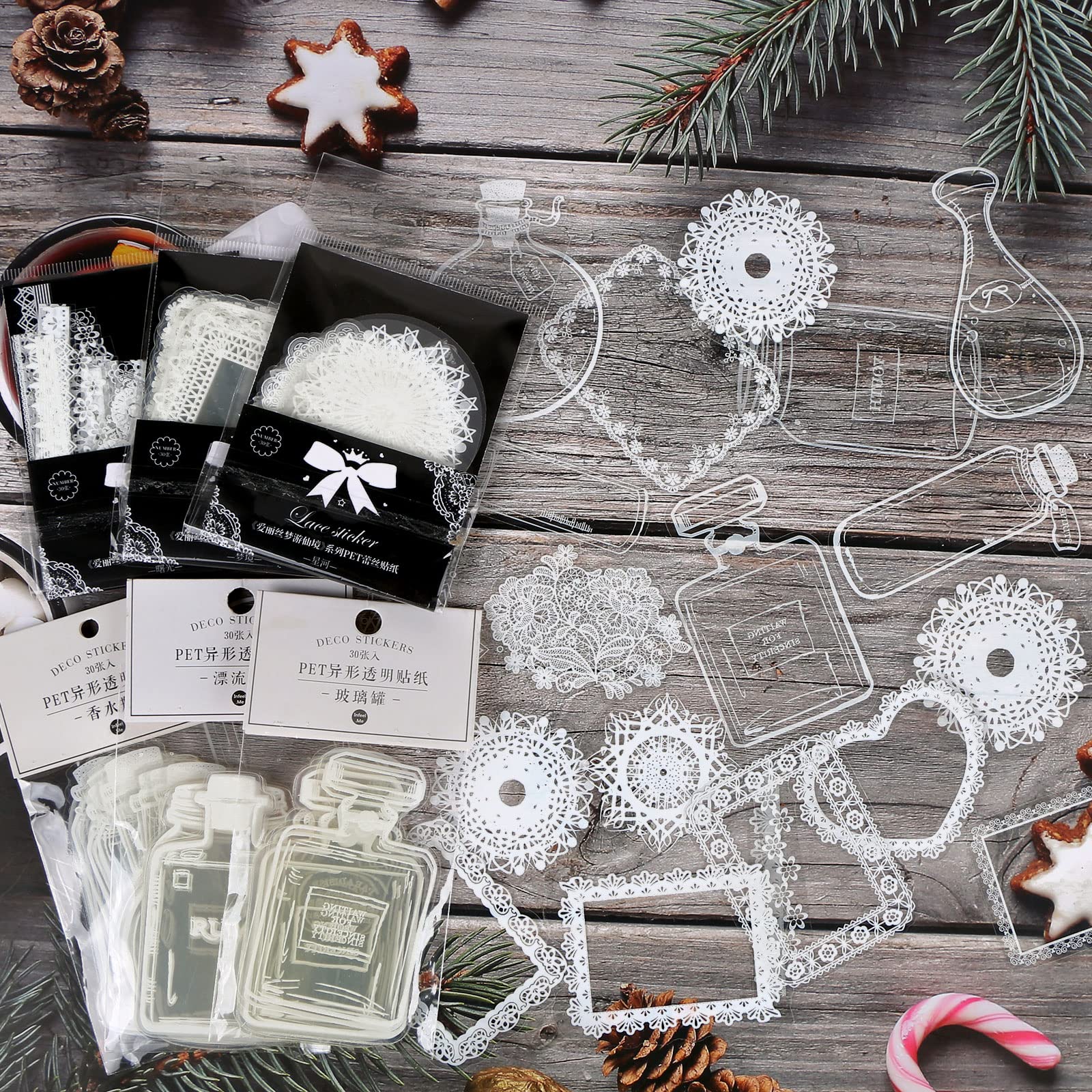 - Package Include: Our transparent sticker set contains two different styles of stickers, including three packs of transparent glassware stickers, each containing three patterns, 10 sheets of each pattern. The other three packs are transparent lace stickers, each containing 15 patterns, 2 sheets of each pattern.