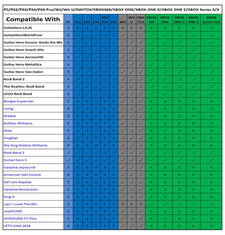 For Guitar Hero World Tour, Guitar Hero Encore: Rocks the 80s, Guitar Hero Smash Hits, Guitar Hero Aerosmith, Guitar Hero Metallica, Guitar Hero Van Halen, Rock Band 2, Rock Band, LEGO Rock Band, Rock Band 1, Guitar Hero 5, Boogie Superstar, U-sing, Grease, Robbie Williams, Glee, SingStar, We Sing Robbie Williams, Karaoke Joysound, American Idol Encore, Def Jam Rapstar, Karaoke Revolution, Sing It, Joysound.