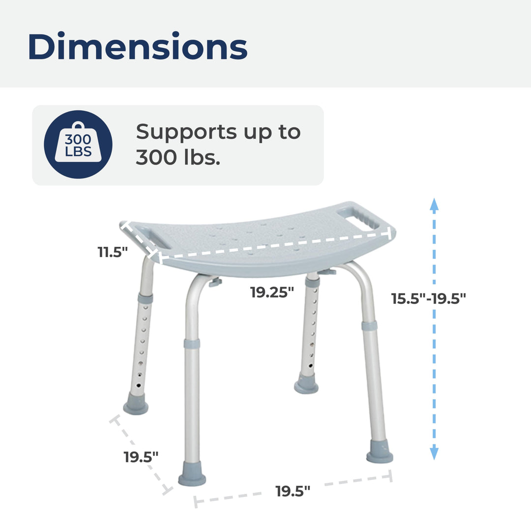 - Comfortably Supports Up to 300 Pounds: Bath bench dimensions: Width: 19.25 Inches x Length: 11.5 Inches; Seat Height: 14 Inch - 12 Inch; Weight capacity: 300 pounds