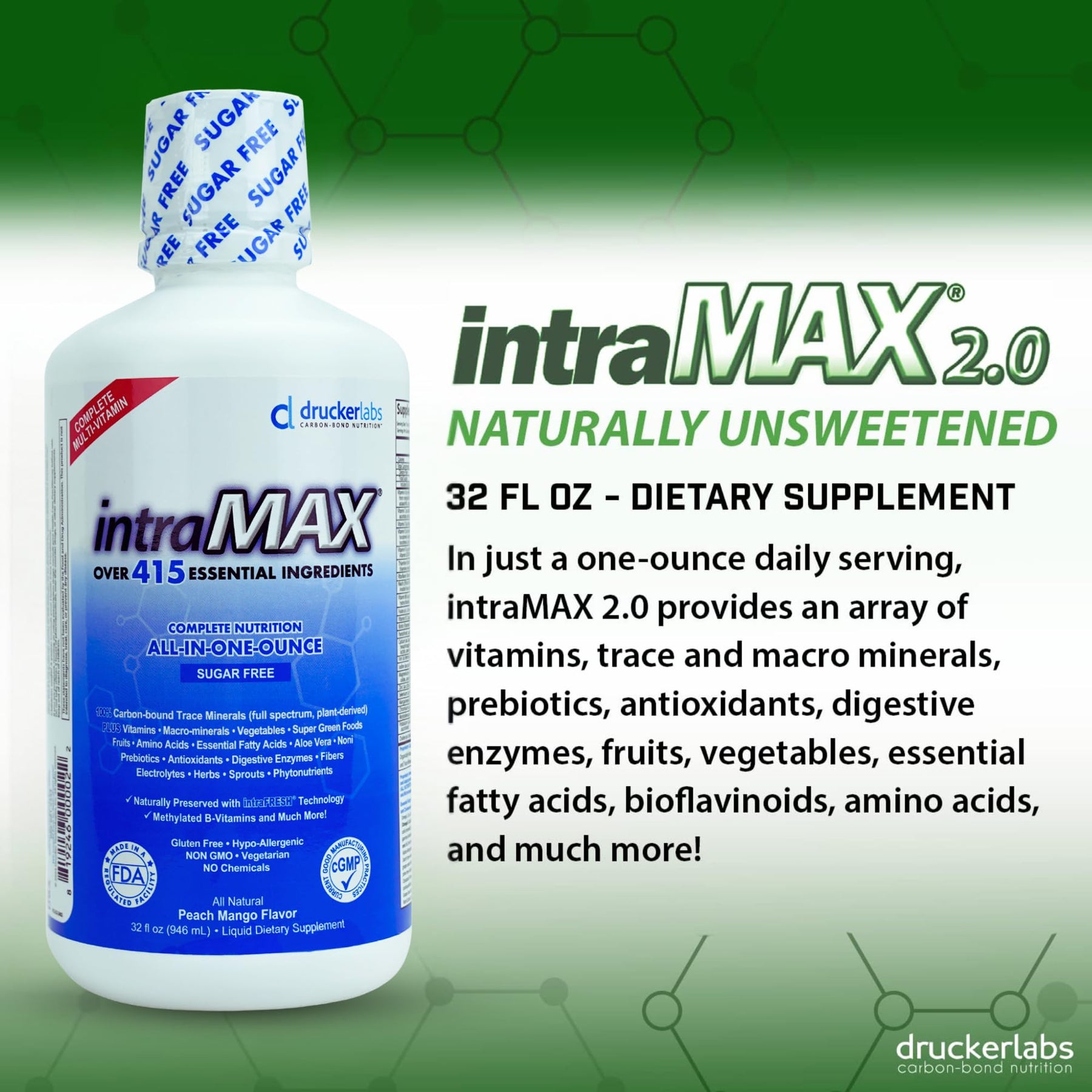 - ENHANCED ABSORPTION RATE & INTRACELL TECHNOLOGY: Drucker Labs IntraMAX 2.0 products are created using a proprietary carbon-bonding process called intraCELL technology. This technology allows living carbon to bind to nutrients within each product to provide a faster, more efficient absorption rate. The result is complete liquid nutrition in just one ounce a day!