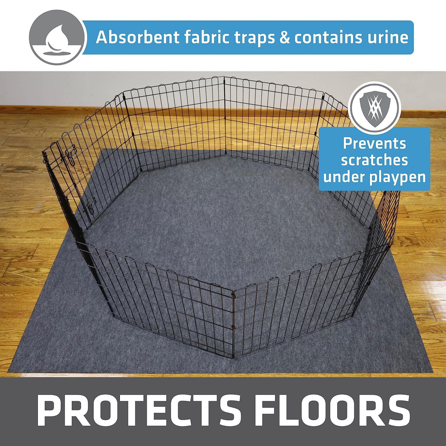 - PROTECTS FLOORS FROM SCRATCHES, SCUFFS, AND CONTAINS ACCIDENTS: Our Dog Playpen Mat is designed to be the ultimate surface protection playpen accessory. Our mat protects your floors, contains any accidents, and provides a soft sure-footed surface that is welcoming to a pet’s paws. MULTI-PURPOSE: Our pet mat can be used for training, whelping, housebreaking, incontinence, and as a pee pad. This mat also works great as a cat litter box mat, dog car seat cover, and cargo trunk liner.