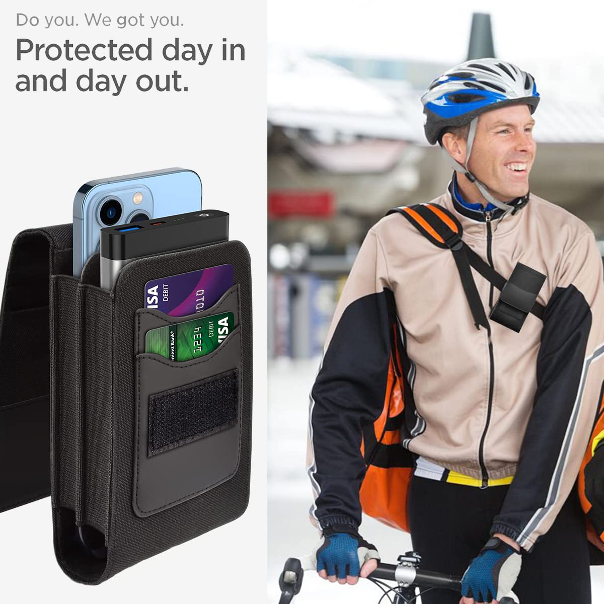 - Cell phone holster case designed with metal belt clip and carabiner hook; with 2 separate compartments for accommodating cell phone and power bank at the same time or holding 2 mobile phones, 2 card slots and 1 wallet case conveniently store credit cards, cash, ID, key, mini data line, RFID Blocking design let everything be in harmony.