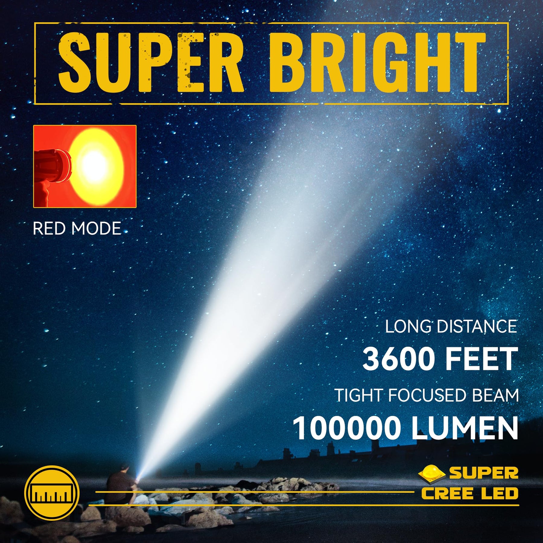 - ?Super Bright & Tight Focused Beam?:The rechargeable spotlight can output 10000 Lumens Brightness, and it has 3 modes which could meet your various needs. Otherwise, our led spotlight can go far for 3600ft with Tight Focused Beam. Because of the above two advantages, you can easily cope with dark environments such as hunting, boat, marine, countryside farm, etc.