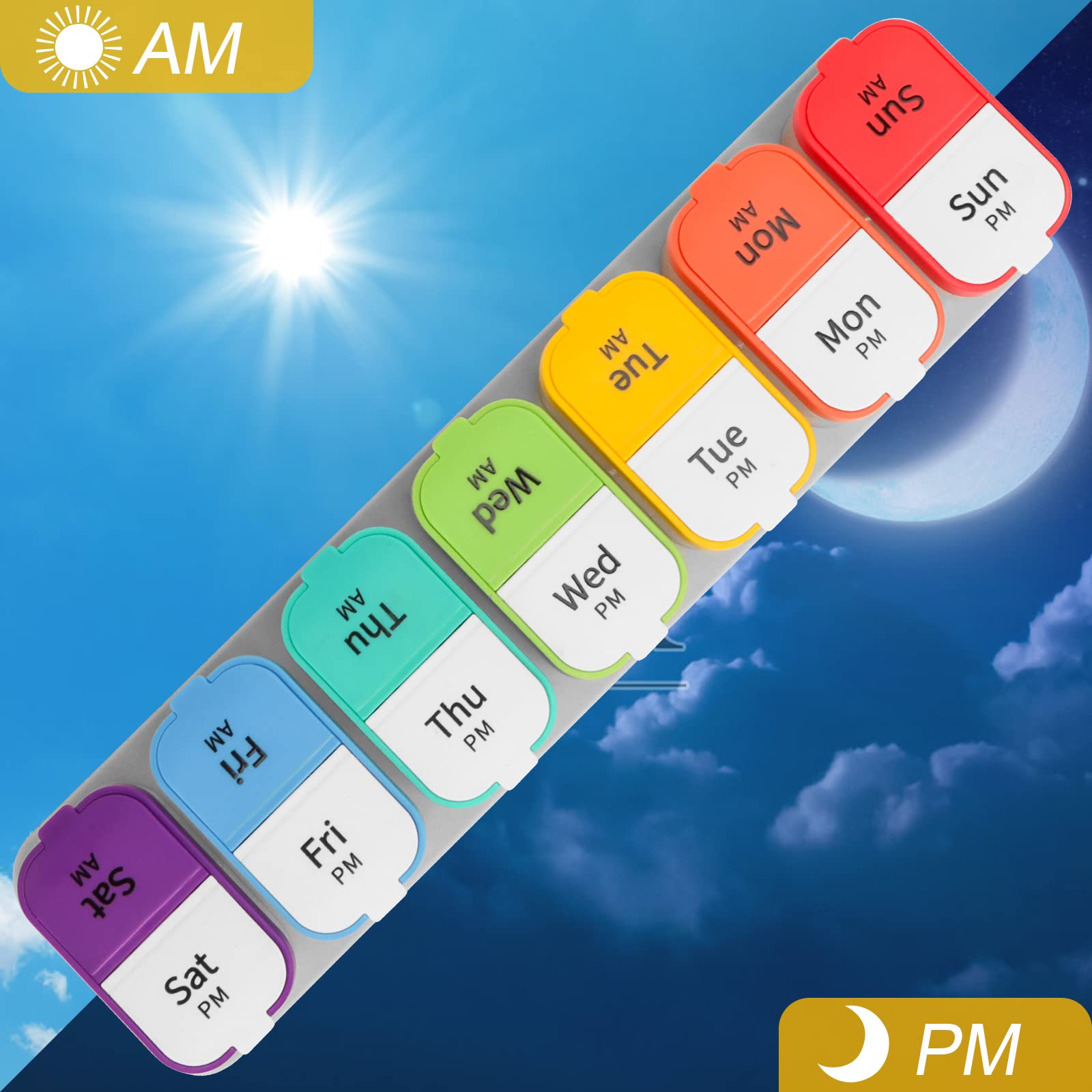 - Large CapacityThe individual compartment size of am/pm weekly pill holder is 13×2.6×2 inches, can contain more medicine than a regular box, perfect for your travel.