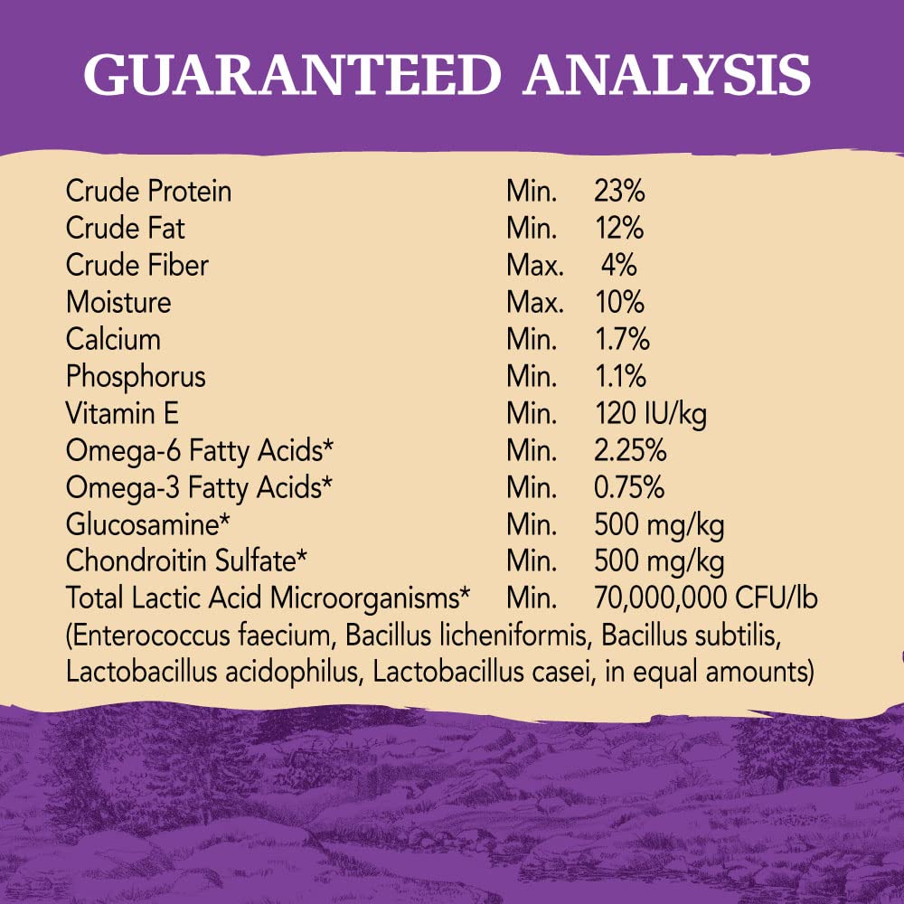 | ingredients | Lamb Meal, Oatmeal, Ground Brown Rice, Dehulled Barley, Chicken Fat (preserved with Mixed Tocopherols), Chicken Meal, Brewers Dried Yeast, Tomato Pomace, Anchovy and Sardine Meal, Rice, Flaxseed, Potassium Chloride, Vitamins Vitamin E Supplement, Niacin, Vitamin A Supplement, Ascorbic Acid (Vitamin C), Thiamine Mononitrate, d-Calcium Pantothenate, Pyridoxine Hydrochloride, Riboflavin, Vitamin D3 Supplement, Biotin, Vitamin B12 Supplement, Folic Acid, Minerals Zinc Proteinate, Zinc Sulfate, Iron Proteinate, Ferrous Sulfate, Copper Sulfate, Copper Proteinate, Manganese Proteinate, Manganese Sulfate, Sodium Selenite, Calcium Iodate, Taurine, Calcium Carbonate, Mixed Tocopherols added to preserve freshness, Inulin, Glucosamine Hydrochloride, Dried Enterococcus faecium Fermentation Product, Dried Bacillus licheniformis Fermentation Product, Dried Bacillus subtilis Fermentation Product, Dried Aspergillus oryzae Fermentation Product, Dried Trichoderma reesei Fermentation Product, Dried Rhizopus oryzae Fermentation Product, Dried Lactobacillus acidophilus Fermentation Product, Dried Lactobacillus casei Fermentation Product, Rosemary Extract, Green Tea Extract, Spearmint Extract. |
