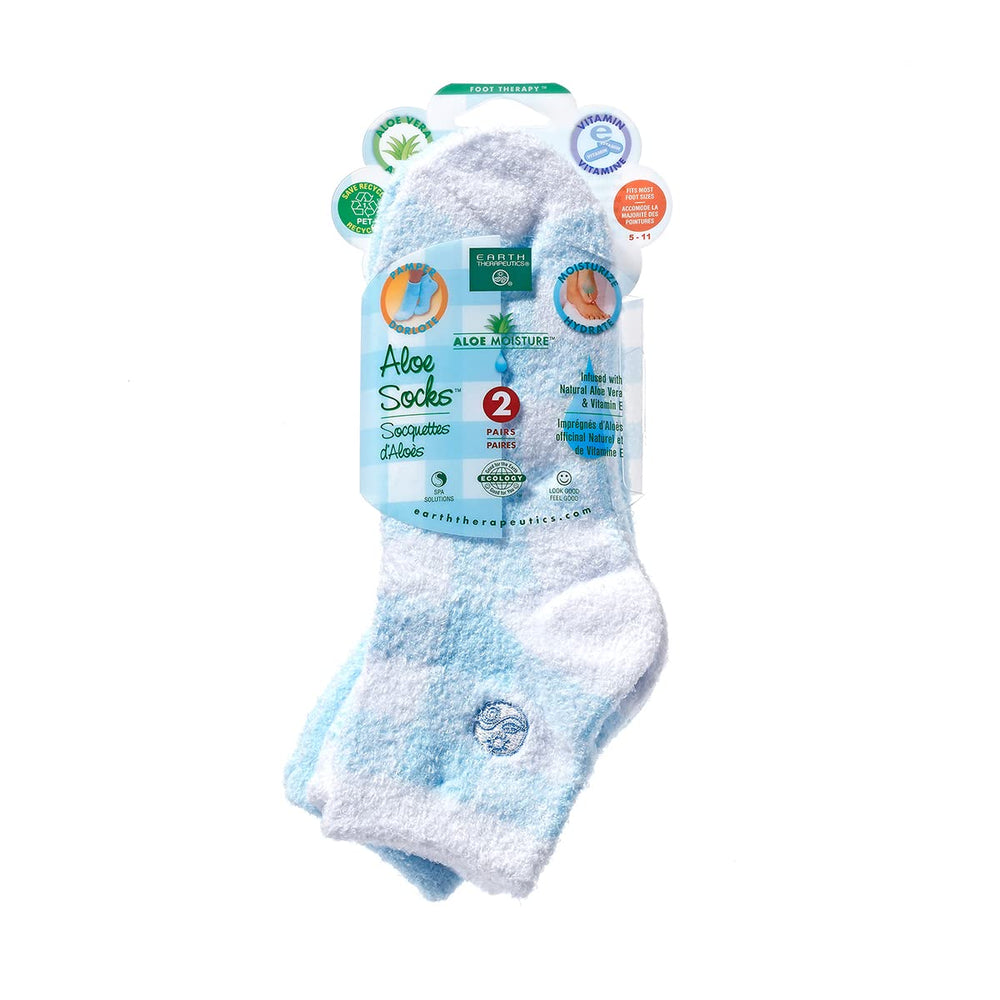 - PREMIUM DESIGN – Earth Therapeutics Aloe Socks are woven with a rich, moisturizing Aloe Vera & Vitamin E infusion that conditions with every step. One size fit most. 86% Nylon, 12.9 % Polyester, 1.1% Polyurethane. Product of South Korea. Cruelty-free and vegan.
