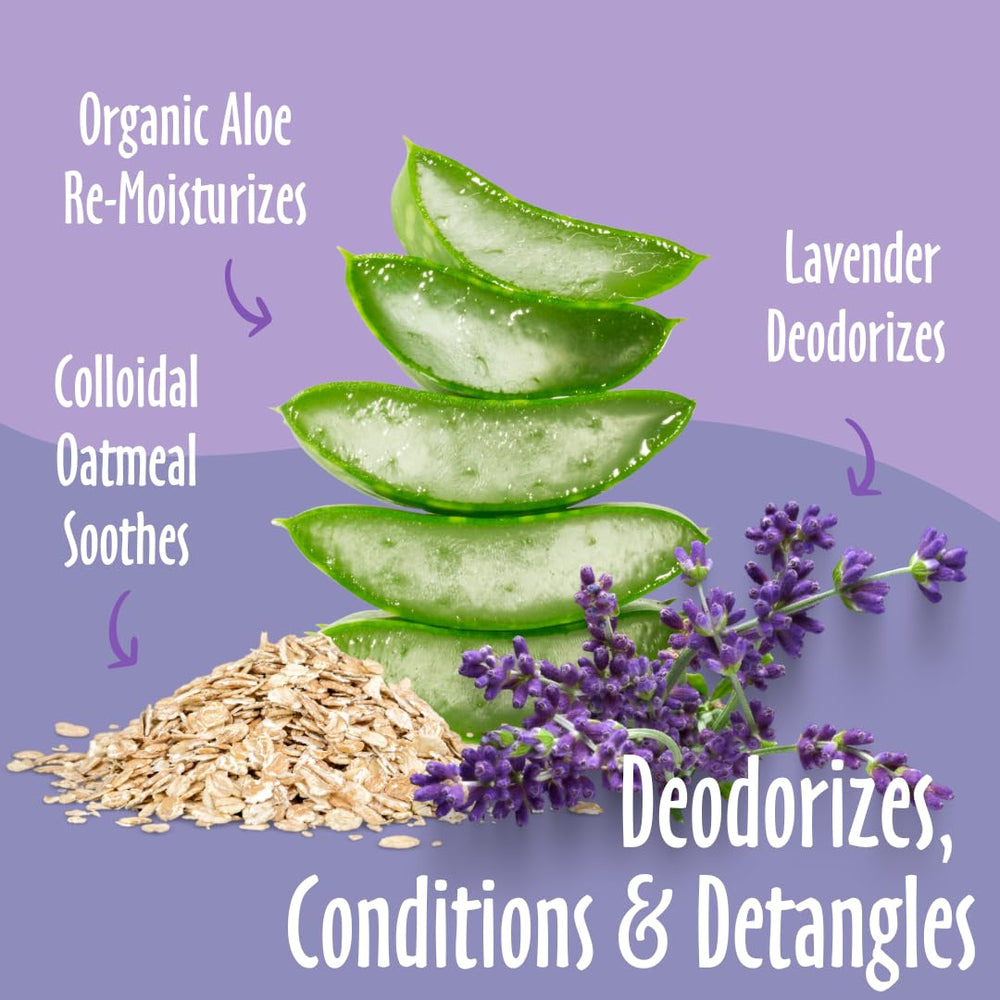 | ingredients | Purified water, renewable plant & coconut-derived conditioner & detangler, colloidal oatmeal, vitamin E, organic aloe vera, panthenol, lavender oil, citric acid, preservative. |