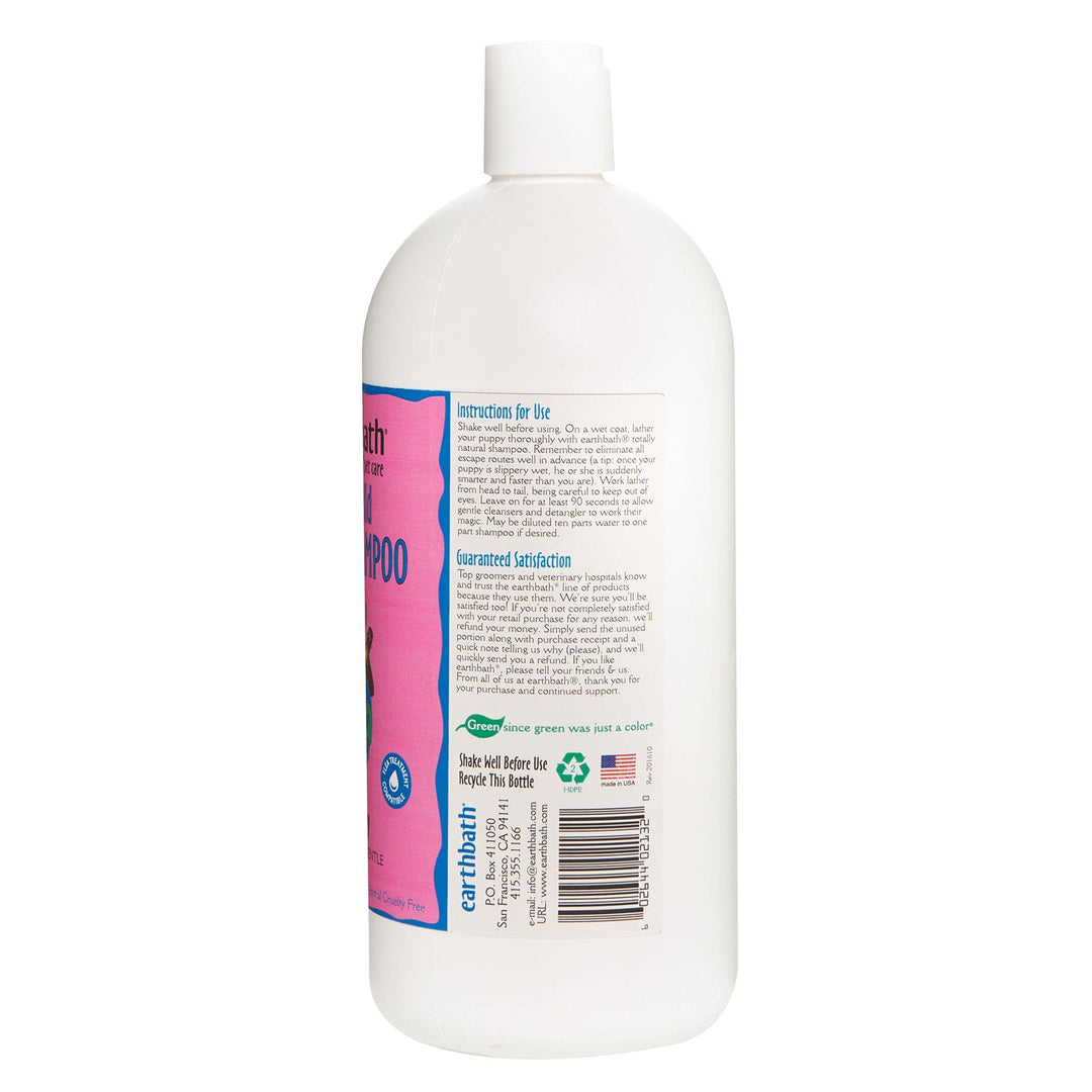 | directions | Shake well before using. On a wet coat, lather your puppy thoroughly with earthbath® puppy shampoo. Remember to eliminate all escape routes well in advance (a tip: once your puppy is slippery wet, he or she is suddenly smarter and faster than you are). Work lather from head to tail, being careful to keep out of eyes. Leave on for at least 90 seconds to allow gentle cleansers and detangler to work their magic. May be diluted ten parts water to one part shampoo if desired. |