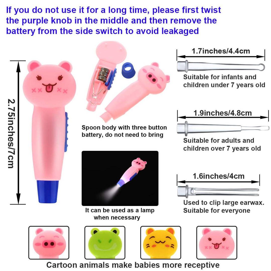 - Various styles: the animal shaped earwax removal kits have 4 different features, include cats, frogs, pigs and bears, lovely and adorable, most children don't like to have their ears cleaned, however, you can clean their ears with these cute ear picks easily